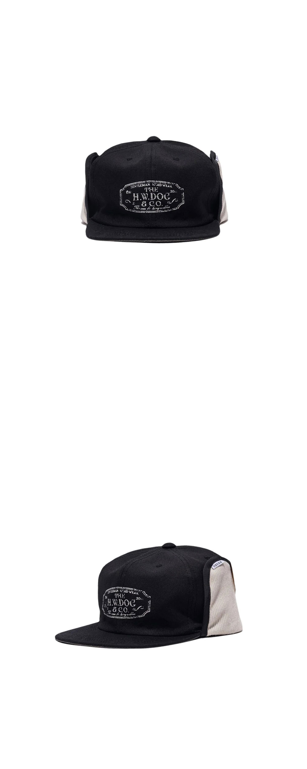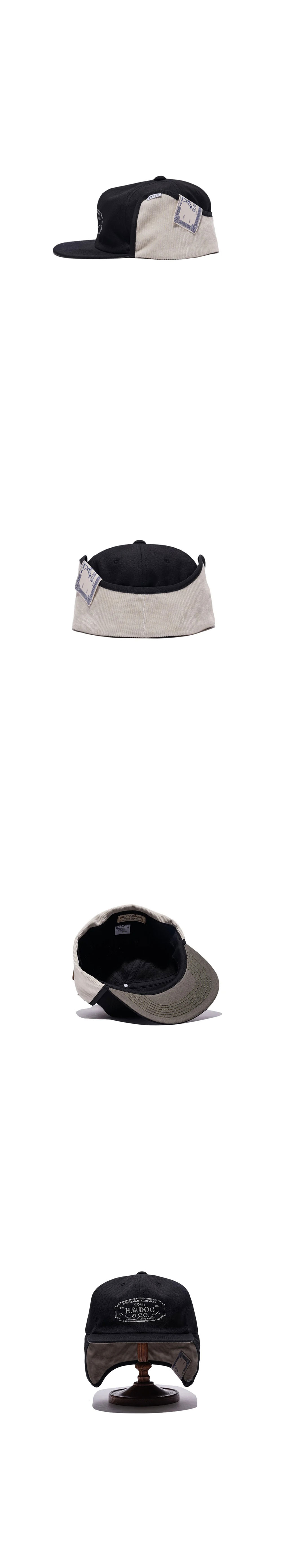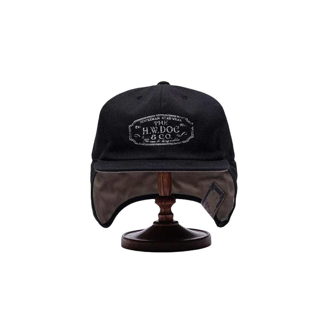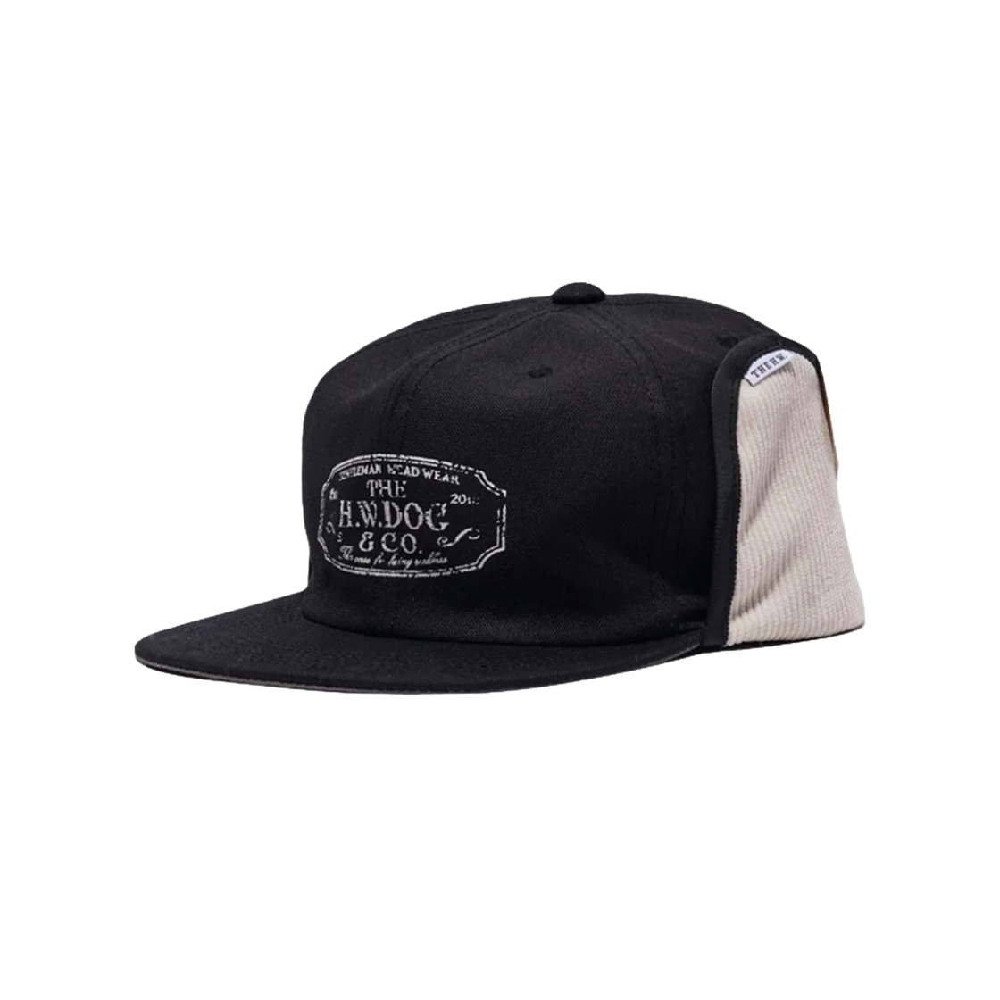 더 H.W. 도그 앤 코 트러커 윈터 캡 블랙입니다. - 이어 플랩으로 기능성과 방한성 향상 - 바디에는 오리 천을, 플랩에는 코듀로이 천을 사용 - 빈티지감 있는 로고 프린트 - 사이즈 조절 테이프