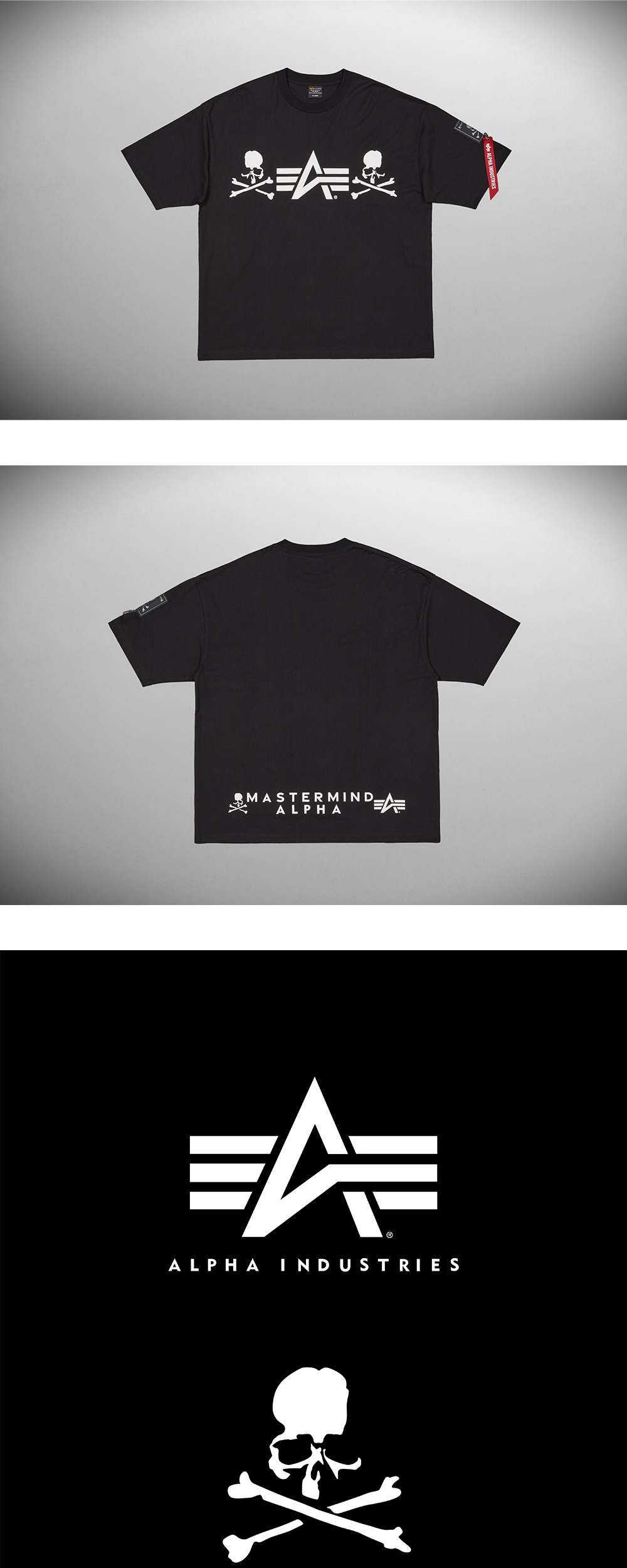 마스터마인드 x 알파 인더스트리 티셔츠 블랙입니다. - 가슴 부분에 Alpha Flying-A와 Mastermind의 해골 모티브 - 뒷단에는 MASTERMIND ALPHA 로고 - Alpha의 시그니처 리본