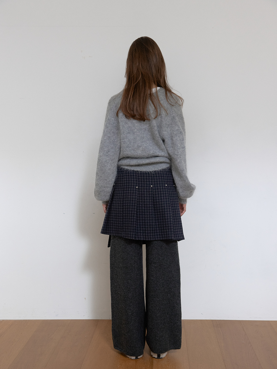 아수라 울 리벳 플리츠 랩 스커트 체크