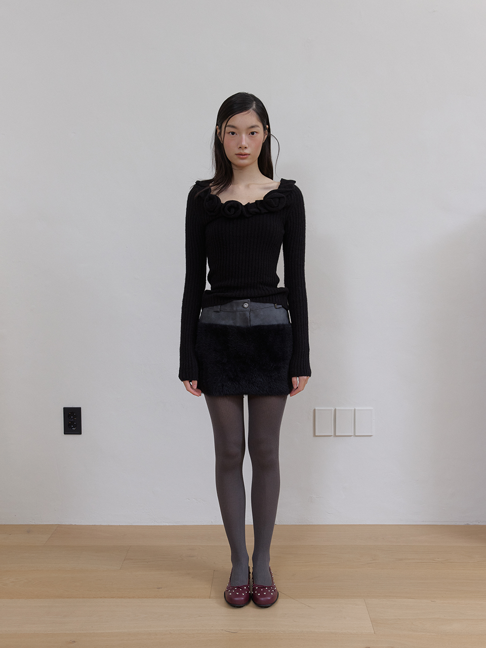 아수라 레더 퍼 믹스 스커트 블랙