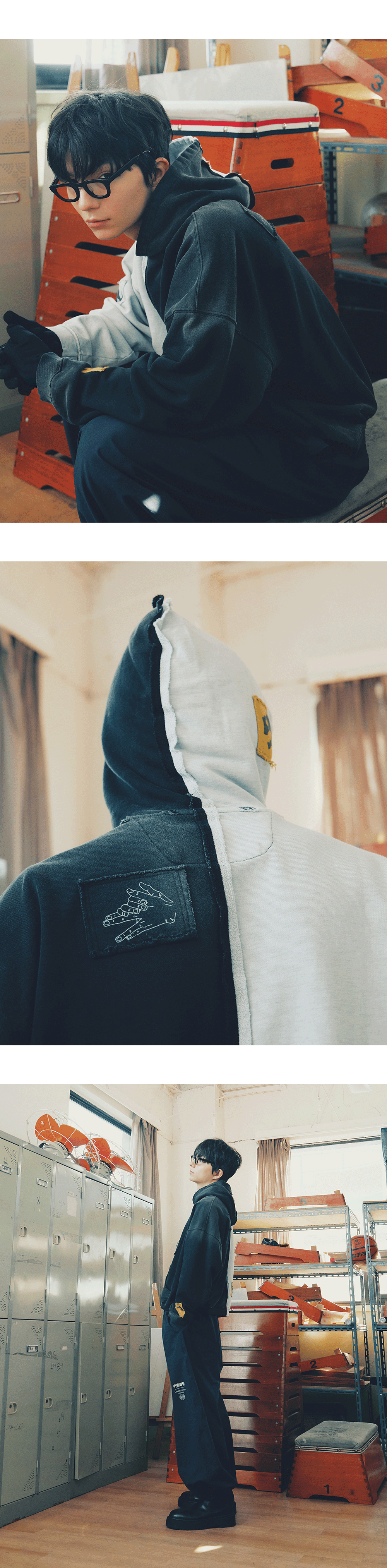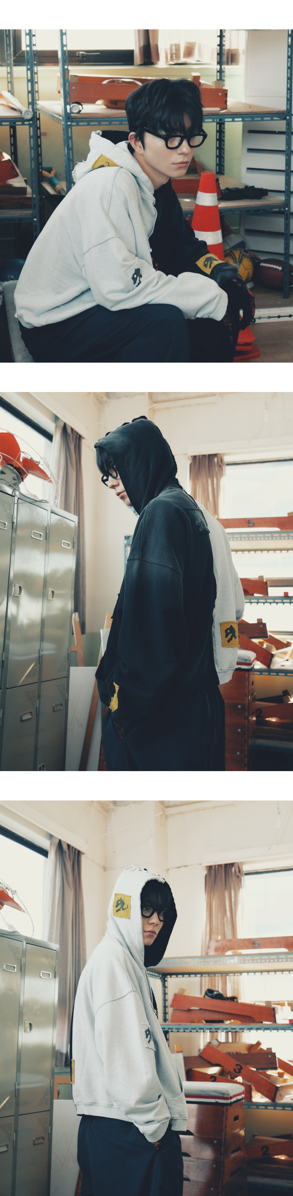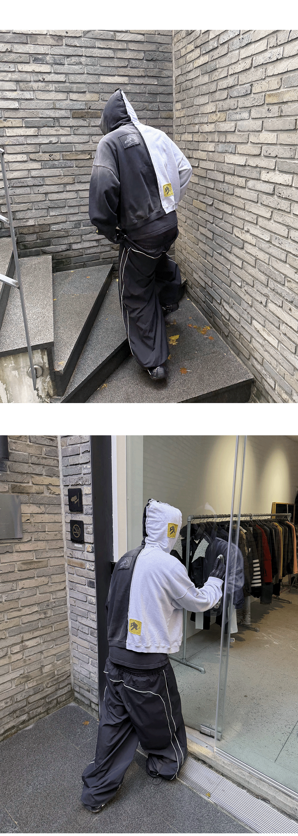 후시구로의 옥견 혼(渾)을 언더마이카 스타일로 재해석한 패치워크 후디 입니다. Model spec - 178cm / 70kg 상의 - Fushiguro Megumi Two Face Vtg Hoodie Dual Ash - Size 2 바지 - Mu.126 Original Logo Piping Line Nylon Pants Black - Size 1