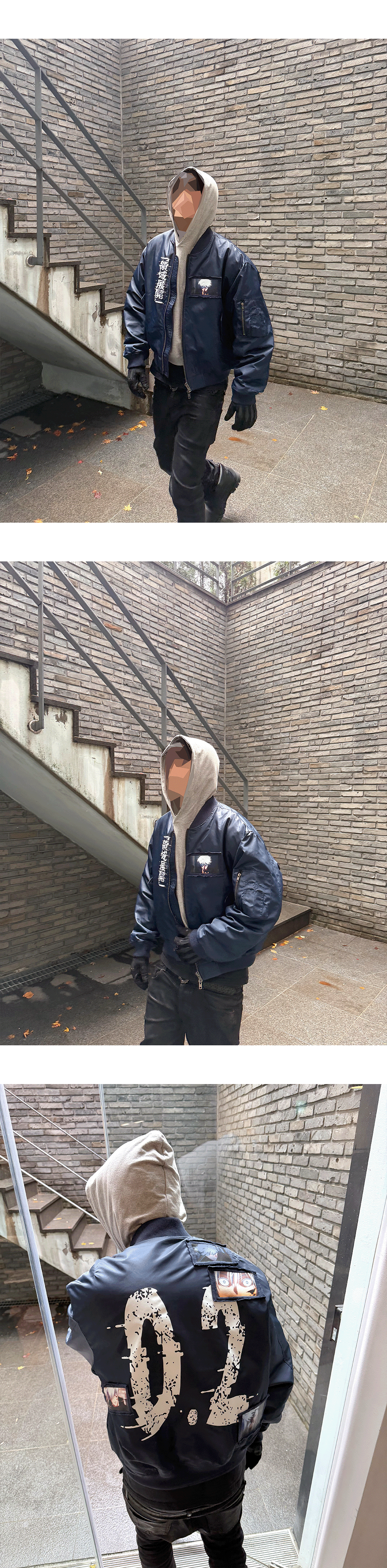 고죠의 0.2초 영역 전개를 그래픽과 패치워크로 재해석한 나일론 MA-1입니다. Model spec - 178cm / 70kg 아우터 - Gojo Satoru Graphic Patch MA-1 Navy - Size 2 이너 - Mu.96 Anti Fxxking Logo Play Light Cropped Hoodie Melange Gray - Size 1 하의 -Black Mamba Slim Fit Red Stitch Wax Coating Jeans Rumba Red – Size 1 ACC - 25FW Ouroboros Loop Buckle Calf Hair Leather Belt Cheetah Green