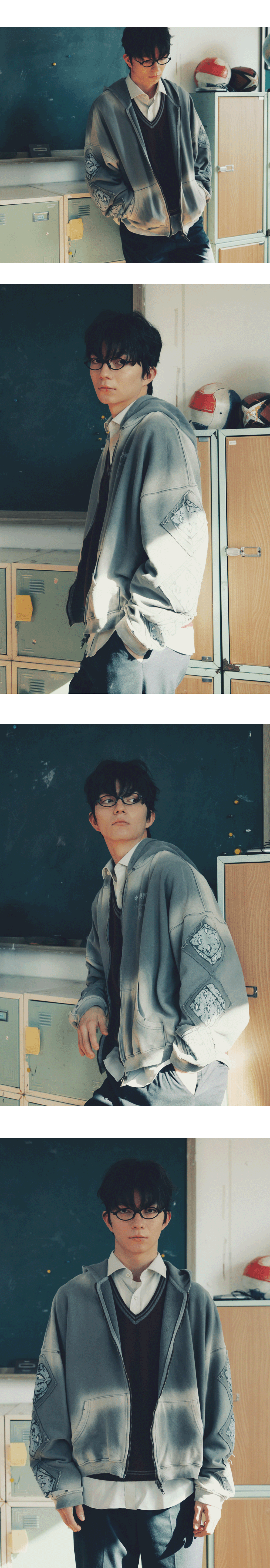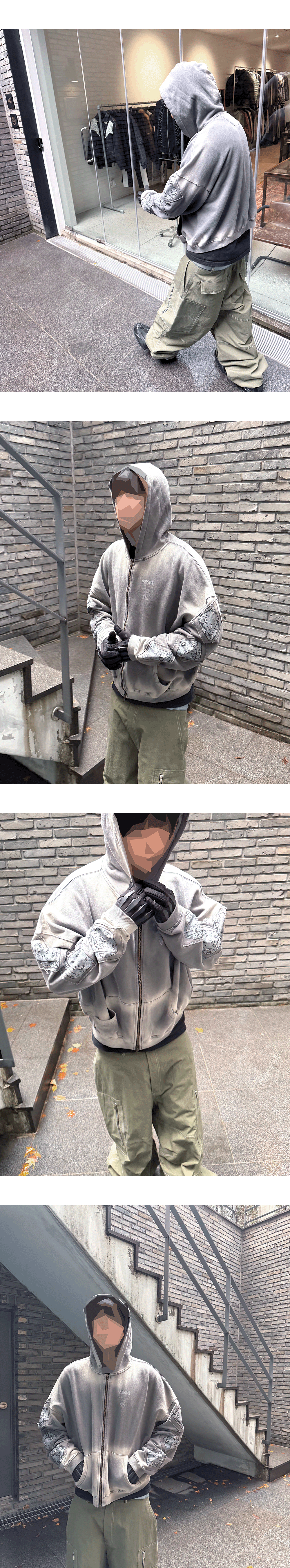 ‘시부야 사변’의 한 장면을 모티브로 한 봉인된 옥문강을 빈티지 패치워크 스타일로 재해석해 디자인된 후드집업입니다. Model spec - 178cm / 70kg 상의 - Prison Realm Patch Vtg Zipped Hoodie Charcoal - Size 2 바지 - 25FW Stitched Wide Cargo Pants Olive - Size 2 악세서리 - 25FW Double Floral Buckle Plain Leather Belt Sky