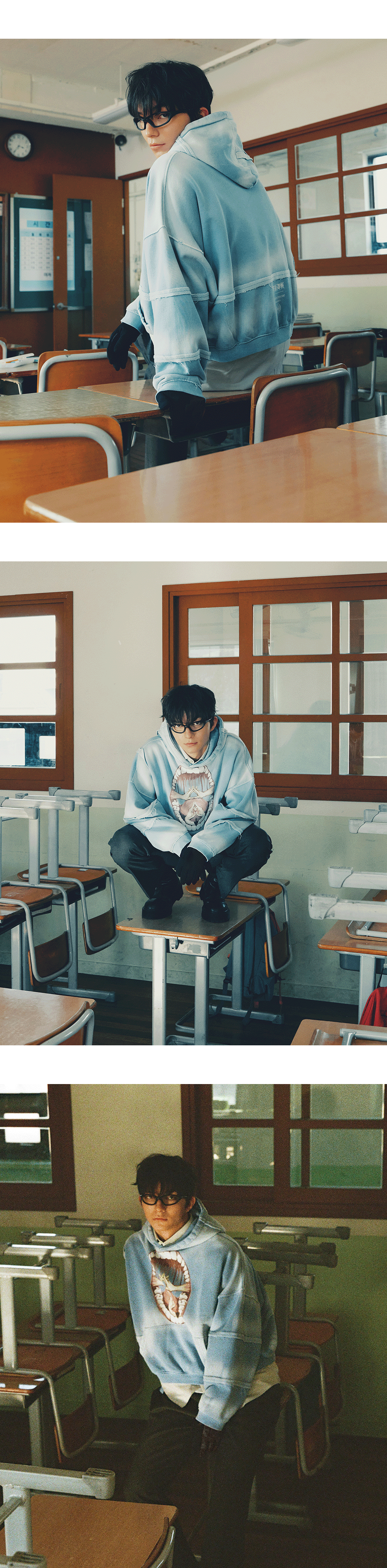 마히토의 상처 자국과 자폐원돈과를 언더마이카 스타일로 재해석한 빈티지 후드입니다. Model spec - 178cm / 70kg 상의 - Mahito Stitched Vtg Hoodie Sky - Size 2 바지 - Mu.126 Original Logo Piping Line Nylon Pants Black - Size 1