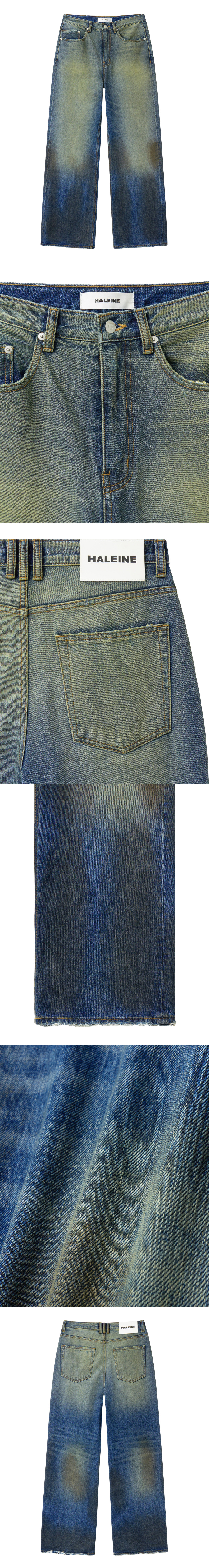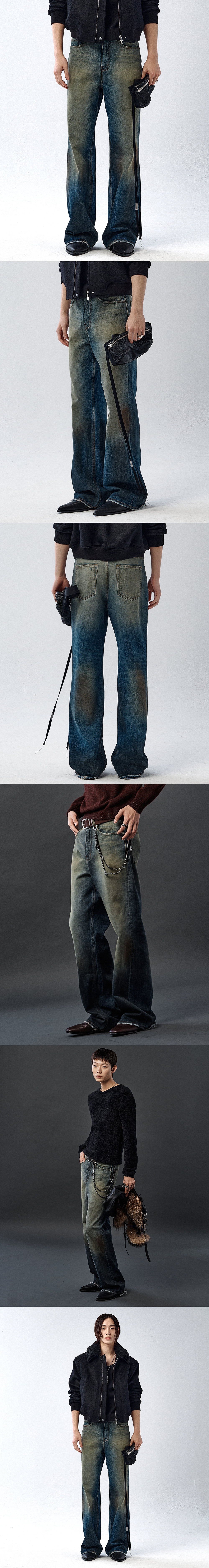 은은한 녹빛이 감도는 데님 베이스에 머드 톤의 더티 워싱을 더해 완성한 세미 와이드 부츠컷 팬츠입니다. 자연스럽게 번진 페이드 컬러와 데미지 가공된 밑단이 어우러져 빈티지한 무드를 연출하며, 넉넉하게 떨어지는 실루엣이 편안하면서도 세련된 실루엣을 완성합니다. -DETAIL- 코튼 데님 원단 머드 더티 워싱 세미 와이드 부츠컷 실루엣 데미지 처리된 밑단 5포켓 디자인 리벳 디테일
