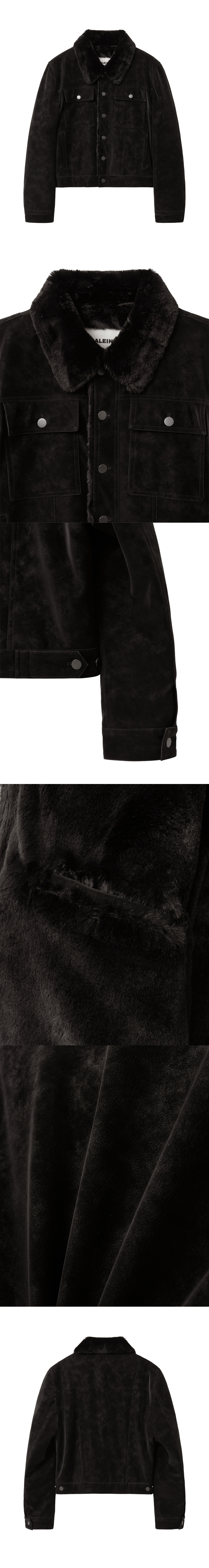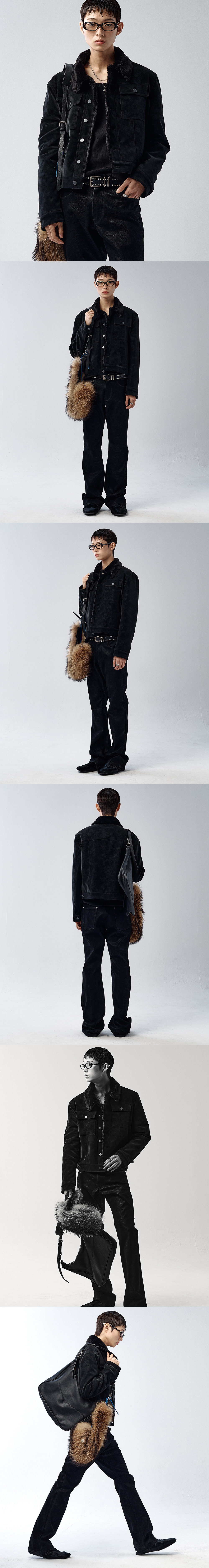 소프트한 벨루아와 스웨이드 질감을 가진 유니크한 터치감의 소재에 인조 퍼를 안감으로 사용한 크롭 실루엣 트러커 자켓입니다. 어깨 패드 삽입으로 직각적인 형태를 형성하며, 칼라와 바디에 시어링을 더해 보온성과 볼륨을 높였습니다. 밑단 탭 디테일이 실루엣의 밸런스를 완성합니다. -DETAIL- 크롭 실루엣 소프트한 벨루아 가공 소재 사용 인조 퍼 칼라 & 안감 소매 퀼팅 안감 프런트 메탈 버튼 여밈 밑단 탭 조절부