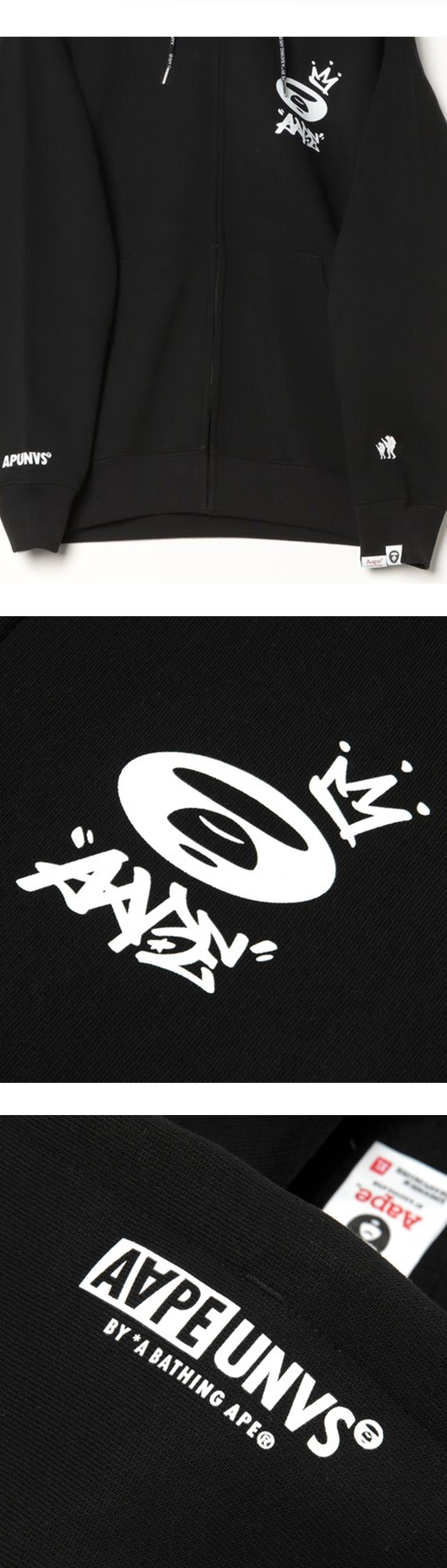 에이프 베이직 집업 스웨터 블랙입니다. - AAPE의 UNIVERSE 시리즈 - 전면 AAPE 그래픽이 포인트인 집업 후디 - 안감 기모 처리로 따뜻하고 포근한 착용감 - 전면 지퍼 여밈과 캥거루 포켓 - 브랜드 로고 후드 스트링 디테일 - 데일리·스트릿 룩까지 폭넓게 활용 가능