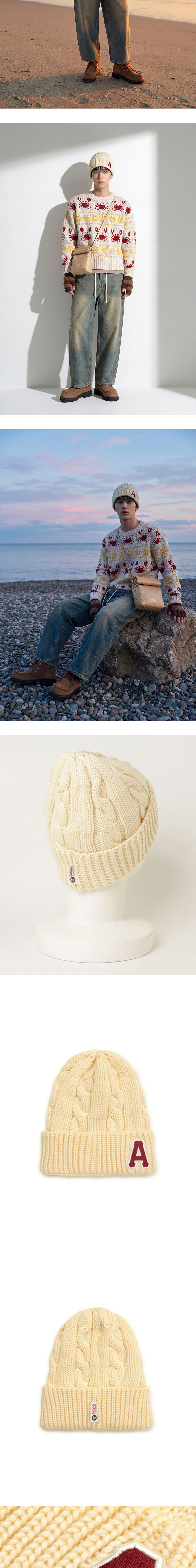에이프 메인 햇 아이보리입니다. - 아크릴 소재의 따뜻한 니트 모자 - 'A' 원포인트 로고 와펜 패치 - 가볍고 부드러운 착용감 ✧ AI로 제작한 콘텐츠가 포함되었습니다.