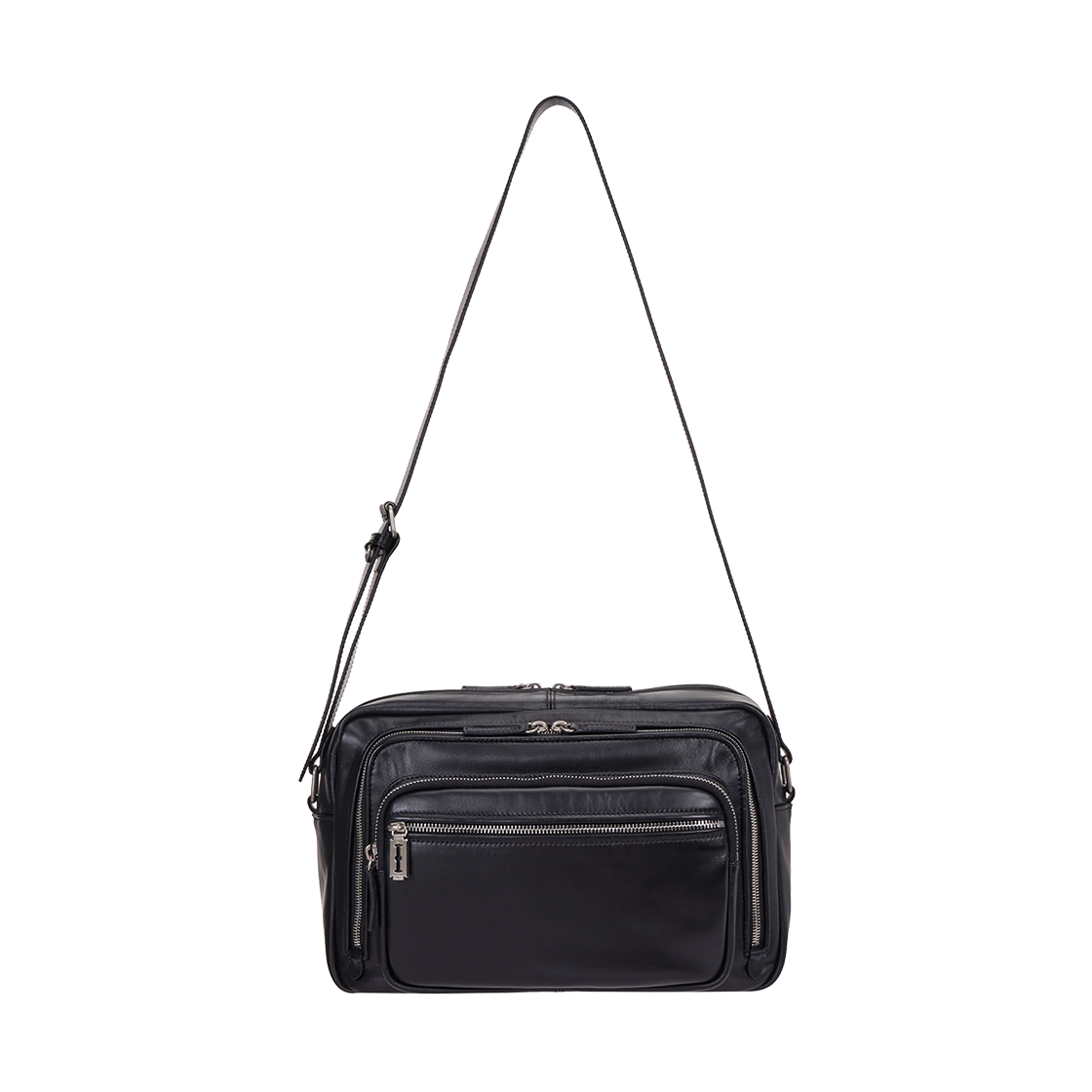 부드러운 직사각형 쉐잎에 4개의 지퍼 포켓으로 수납력 좋은 크로스 백착용 시 지퍼들이 자연스럽게 쳐지는 것이 특징스트랩에 D링 고리가 있어 참 장식 연출 가능