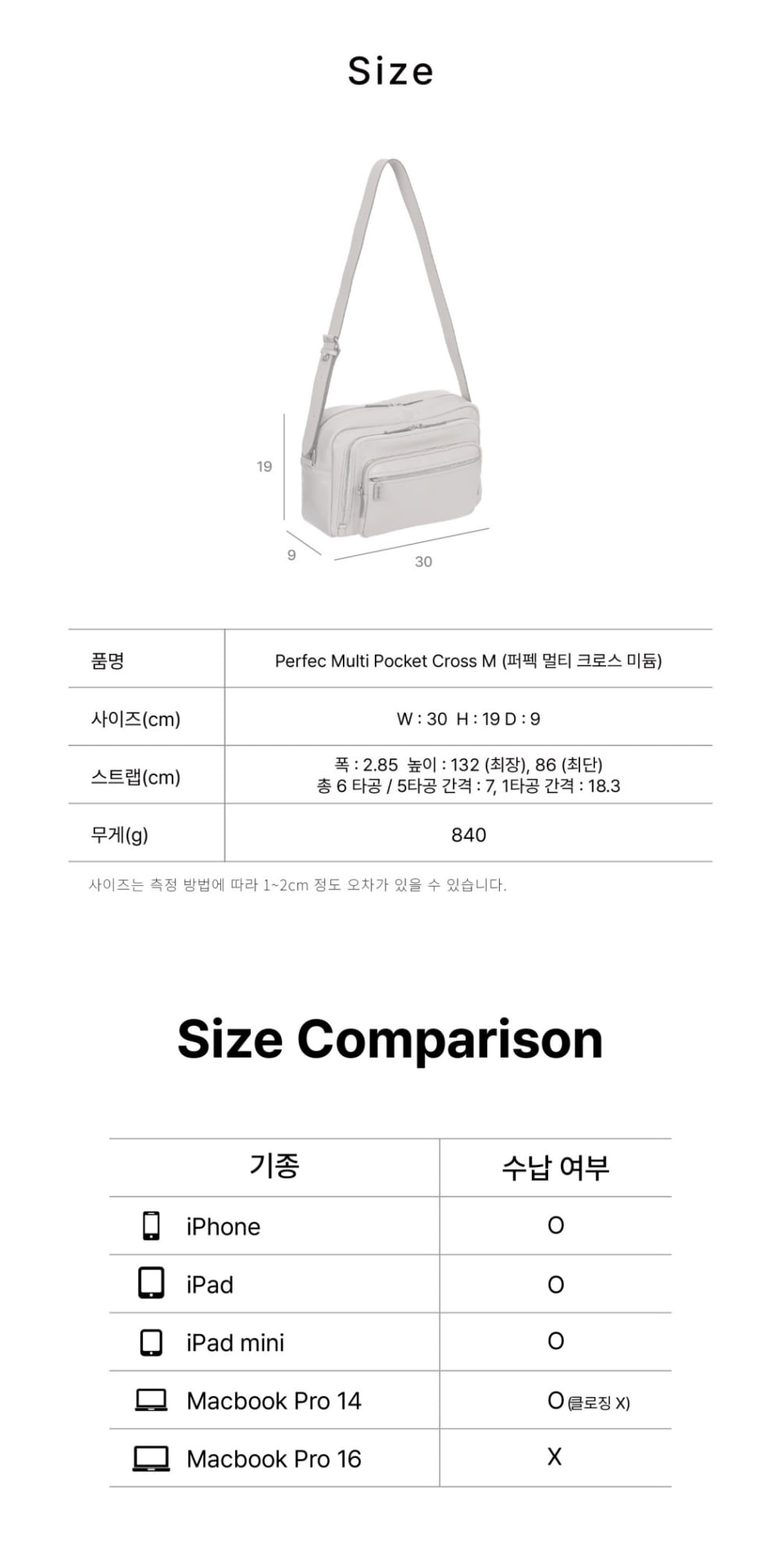 부드러운 직사각형 쉐잎에 4개의 지퍼 포켓으로 수납력 좋은 크로스 백착용 시 지퍼들이 자연스럽게 쳐지는 것이 특징스트랩에 D링 고리가 있어 참 장식 연출 가능