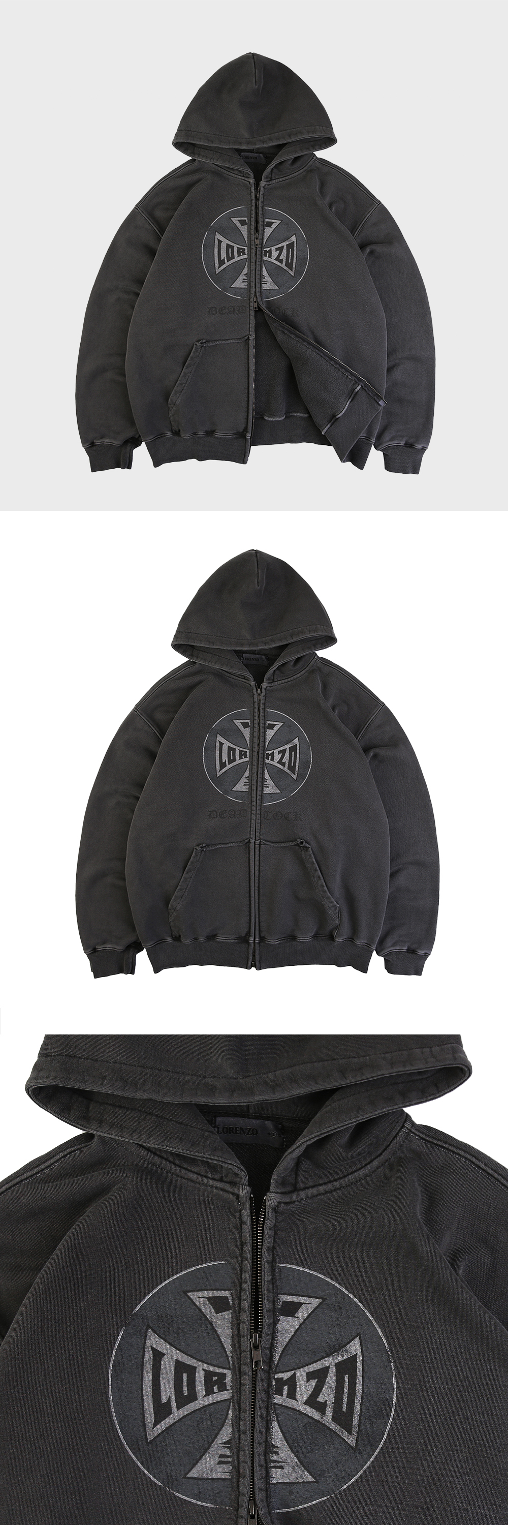 전면부 시그니처 그래픽이 빈티지하게 들어간 후드집업으로 2way zip을 통해 다양한 연출이 가능한 제품입니다. *기모없는 제품