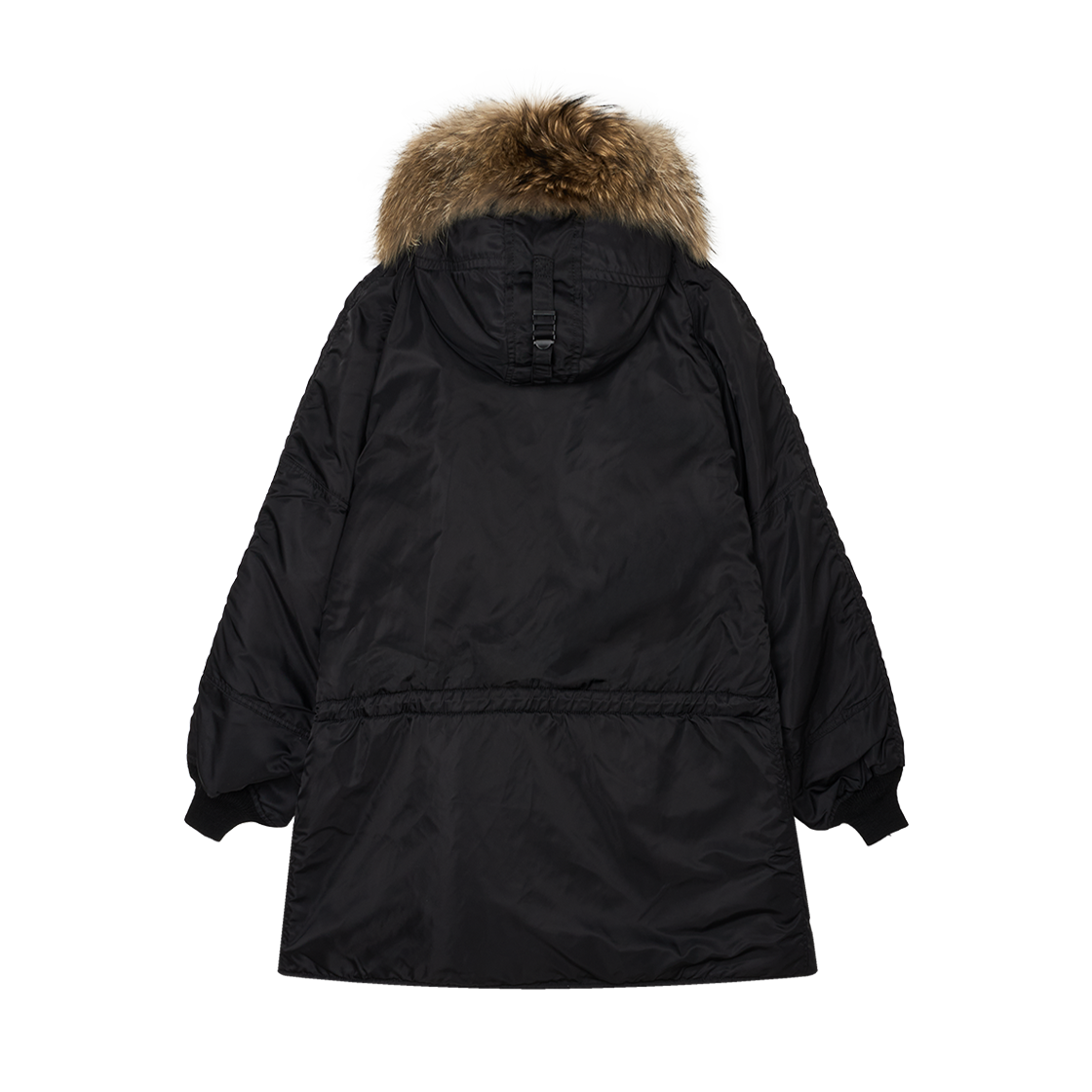 아비렉스 7522 N-3A 블랙입니다. - 풍성한 퍼 트리밍 후드가 돋보이는 롱 파카 - 은은한 광택의 나일론 쉘 - 울 100% 튜브 소매 리브 - 플랩 포켓과 소매 유틸리티 포켓 구성 - 전면 지퍼와 버튼 이중 여밈