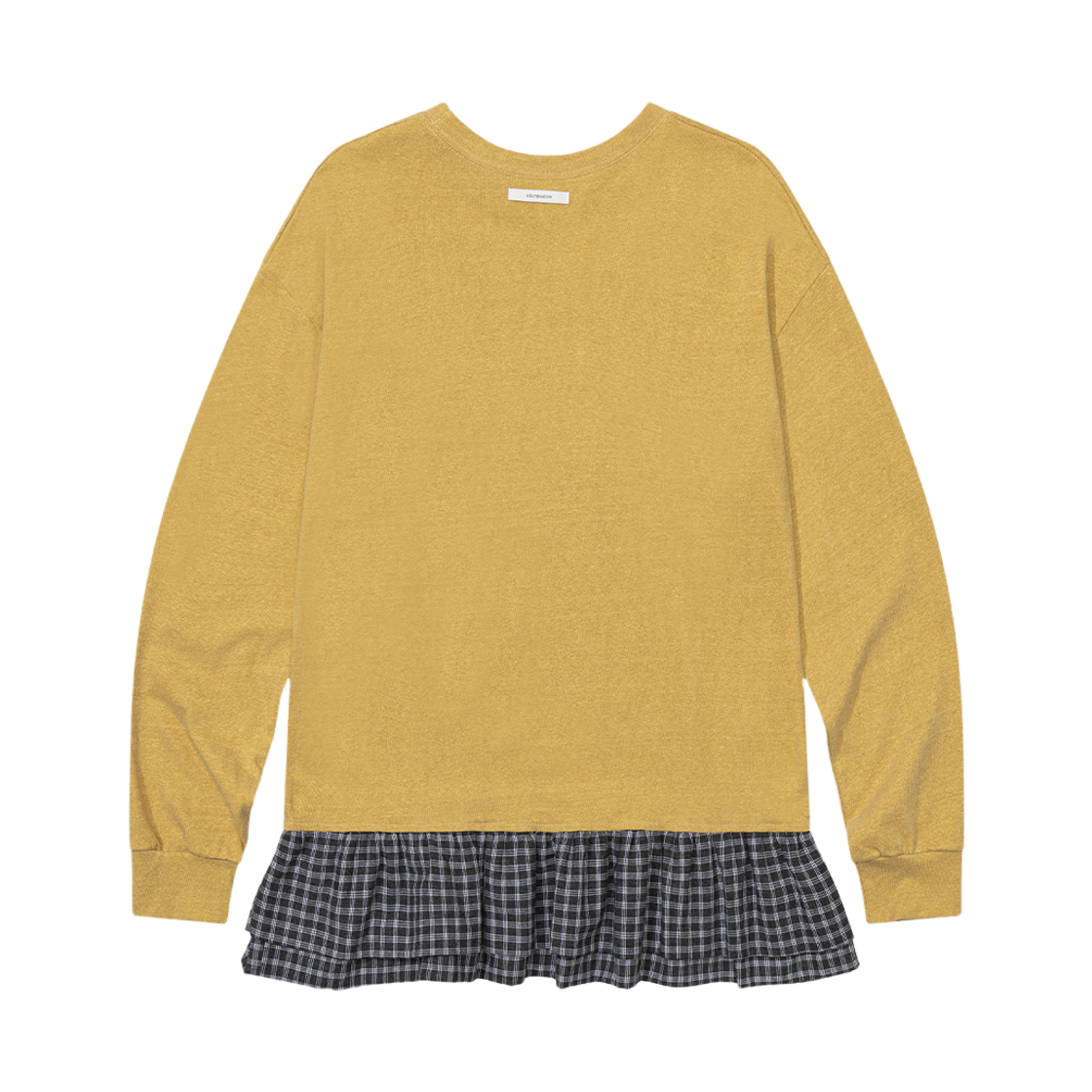 앞면의 체크 스타가 포인트 되며, 밑단 러플로 디자인 된 롱 슬리브 입니다.