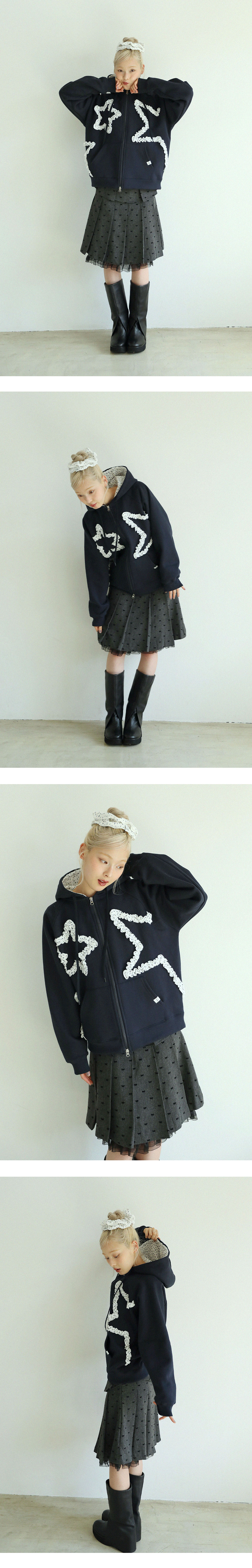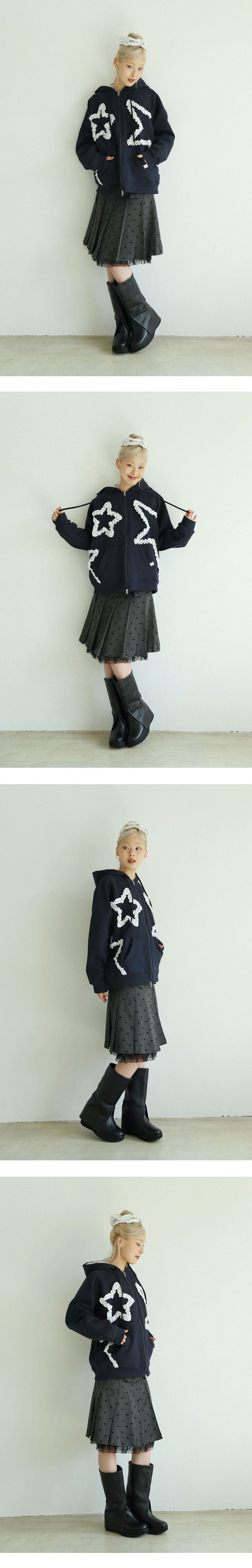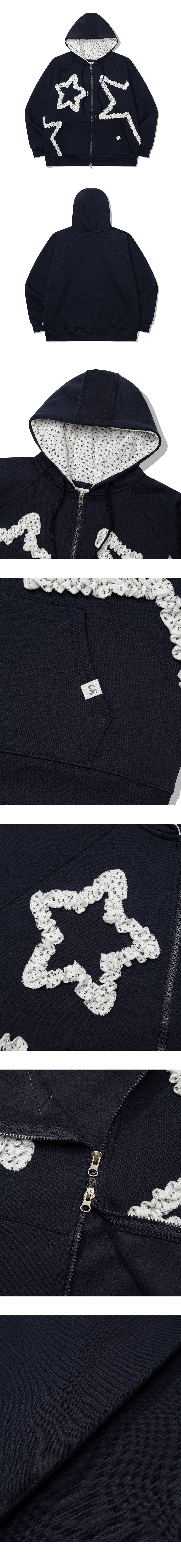 입체감 있는 스타 러플이 포인트인 후드 집업입니다.