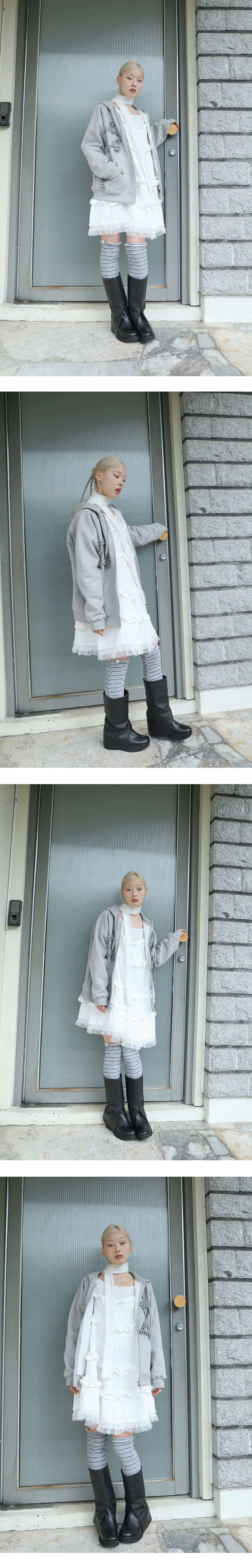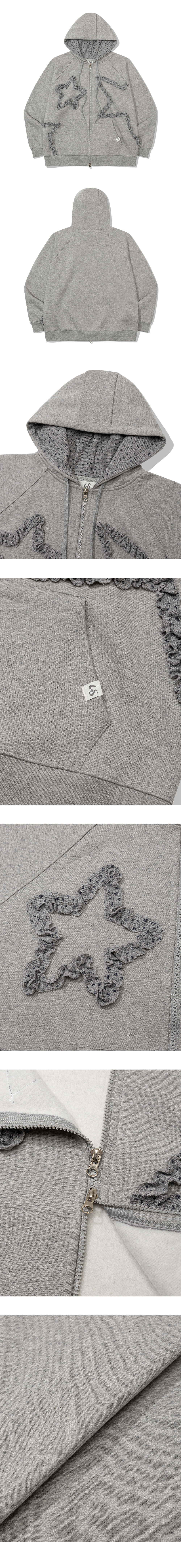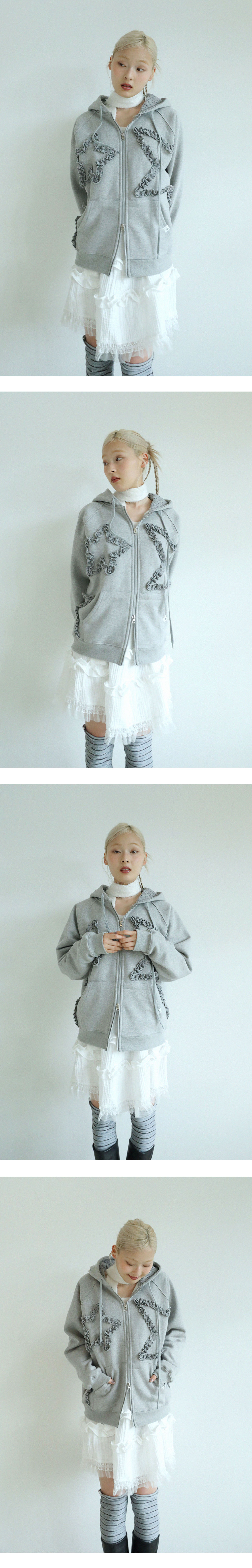 입체감 있는 스타 러플이 포인트인 후드 집업입니다.