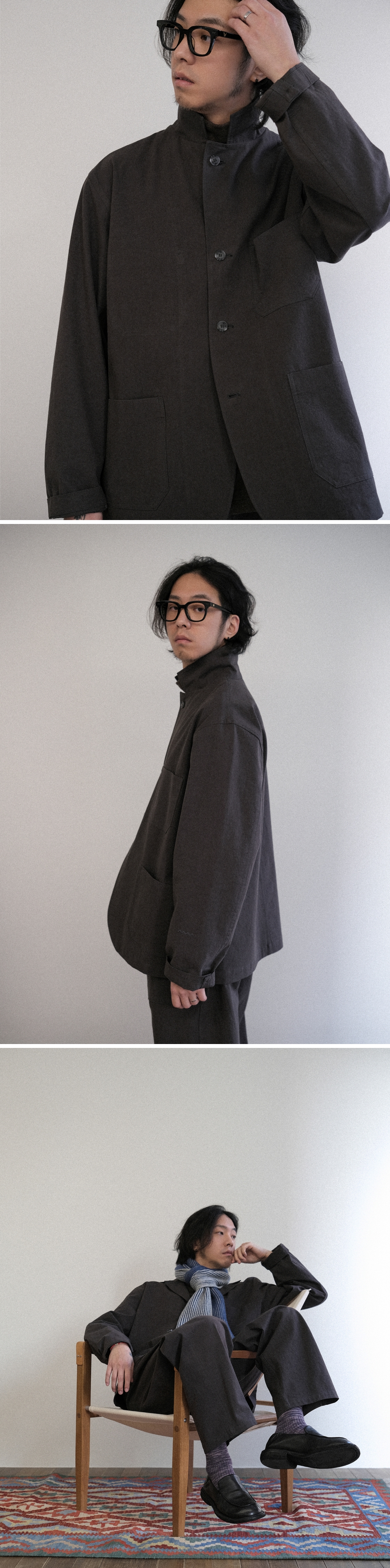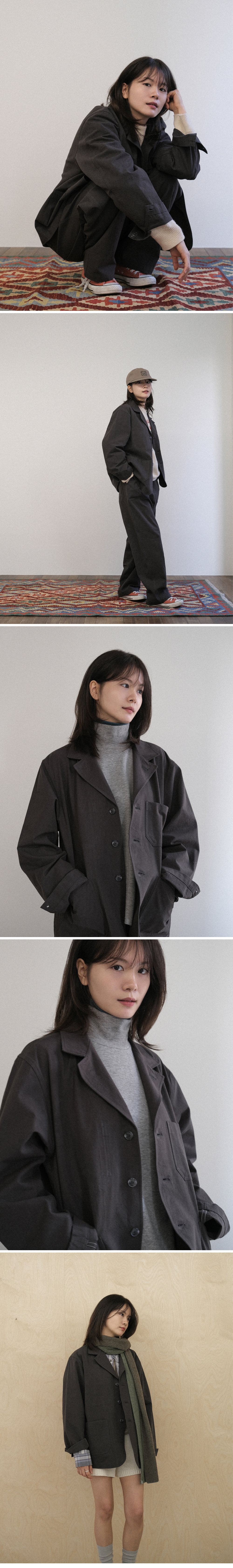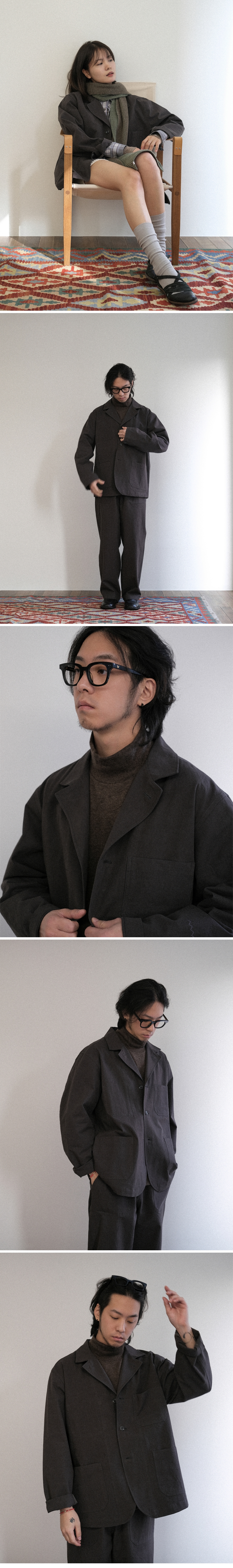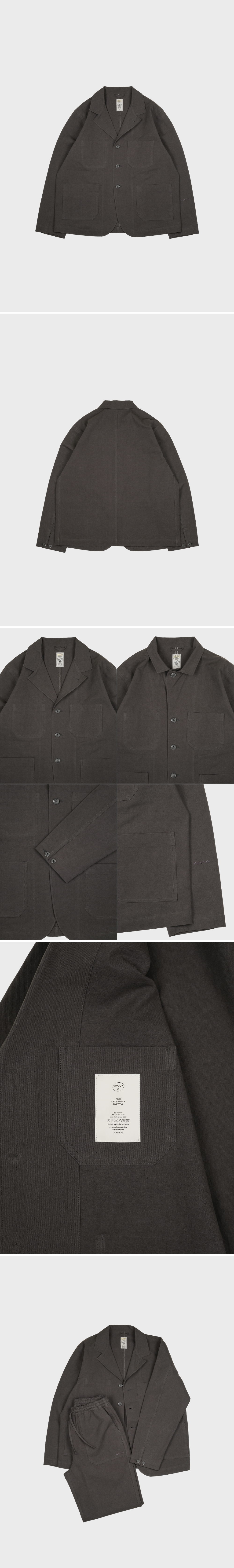 - 일상과 격식 있는 자리 모두 자연스럽게 어울리는 오버사이즈 셋업 자켓 - 매트하고 탄탄한 면 원단에 바틱 염색으로 완성한 내추럴, 빈티지 무드 - 40수 두께감으로 봄, 가을, 추운 겨울에는 이너로 활용 가능 - 라펠에 있는 첫 번째 단추까지 채울 수 있어 다양한 연출 가능 - 전면 세 개의 포켓과 내부 포켓으로 뛰어난 수납성 - 자켓을 걸 수 있는 뒷목 고리와 소매단 시그니처 로고 자수로 포인트 편안하게, 멋스럽게. Work and Walk ! 색상 차콜 (따뜻한 브라운 톤이 느껴지는 컬러) 모델 w 162 / 43 (상의 1) m 176 / 65 (상의 3)