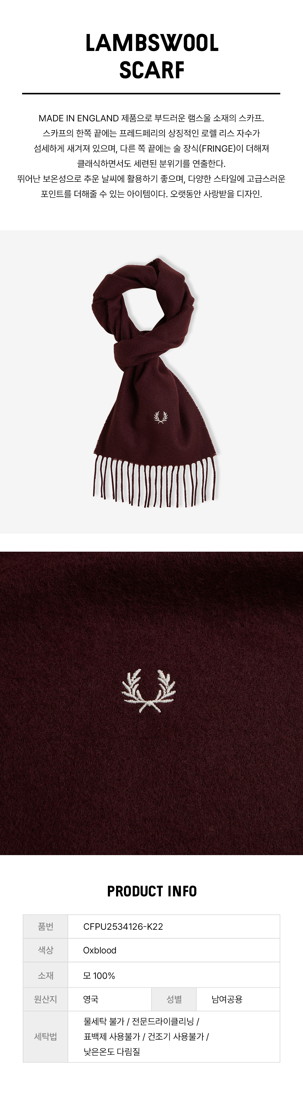 프레드페리 램스울 스카프 옥스블러드