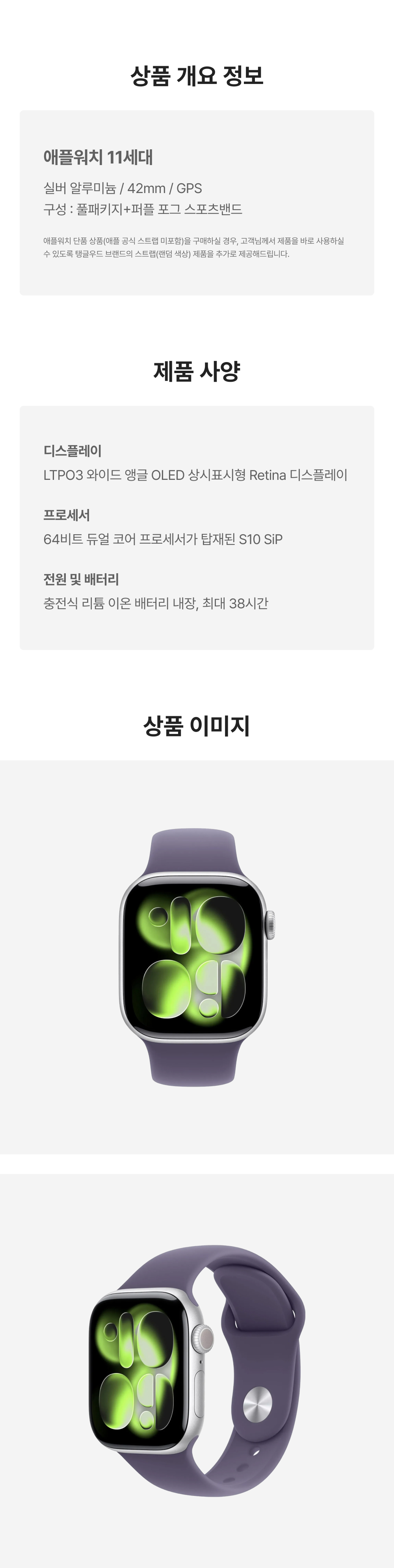 [A등급] 리퍼비시 애플워치 11 42mm GPS 실버 알루미늄 케이스 스포츠 밴드 퍼플 포그