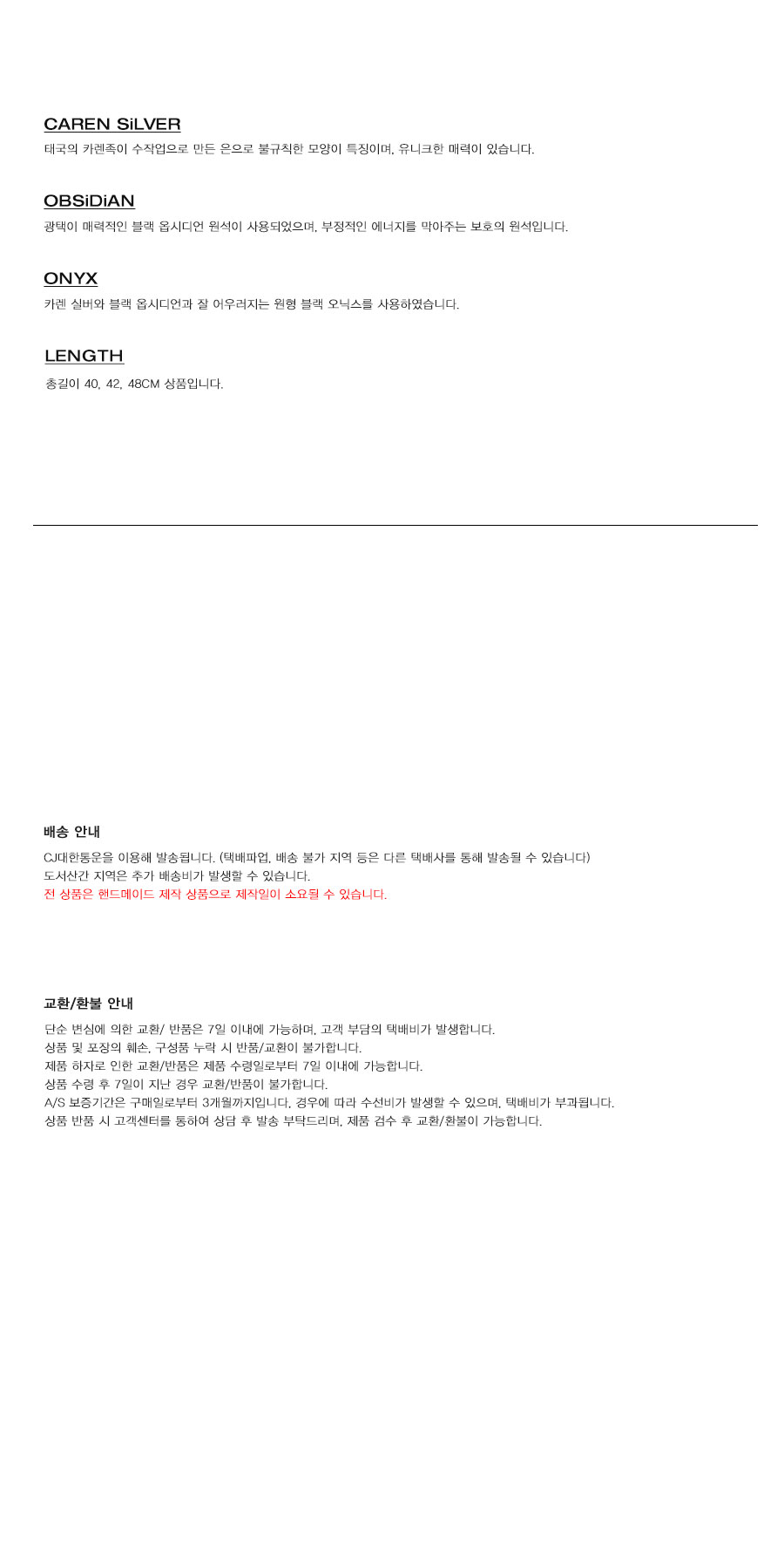 NiRO의 모든 제품은 핸드메이드로 주문 후 최대 10일 이내에 걸쳐 주문 제작됩니다. 카렌 실버와 랜덤한 모양의 옵시디안과 원형 오닉스를 사용한 디자인으로 제품마다 다른 유니크한 목걸이입니다. 여성 추천 사이즈 40CM 42CM 남성 추천 사이즈 48CM