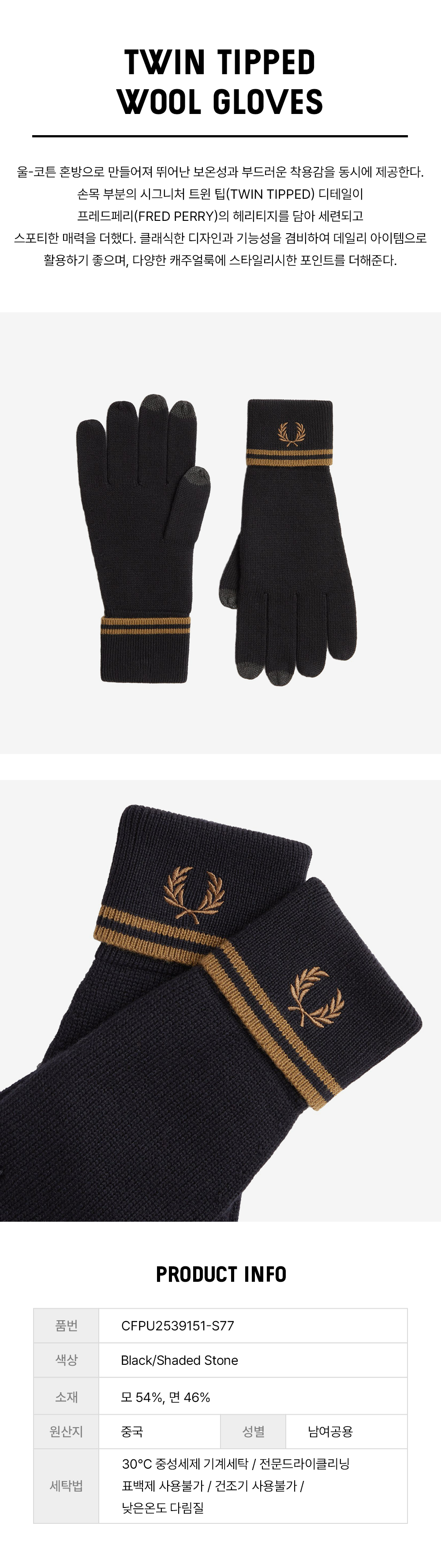 프레드 페리 트윈 팁 울 글러브 블랙 쉐이디드 스톤