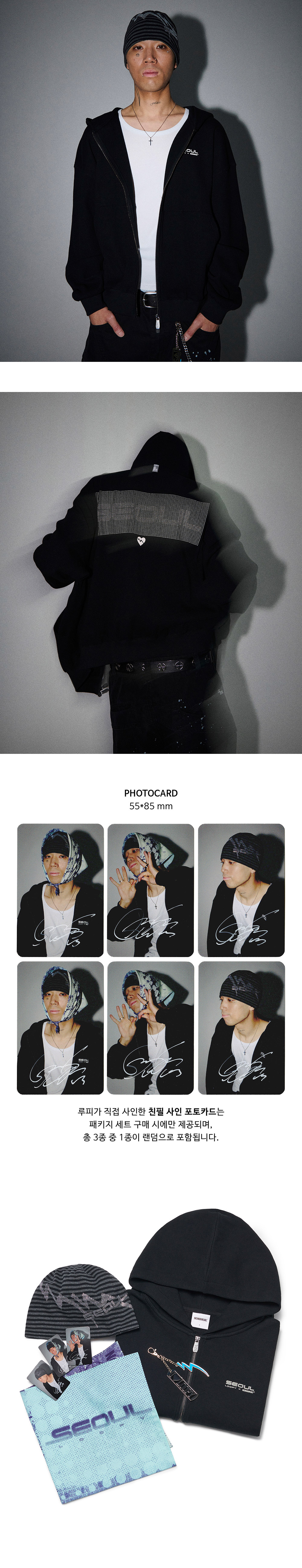 PRODUCTS NM X LOOPY STAR WAFFLE HOODED ZIP-UP - BLACK NM X LOOPY HOTFIX STRIPED BEANIE - BLACK NM X LOOPY SEOUL COLLAGE BANDANA NM X LOOPY I LOVE LOOPY KEYRING MODEL MAN : 170CM (FREE SIZE) * 반품/교환 시 사인카드를 포함한 전 구성품을 반드시 동봉해야 하며, 누락 시 처리가 제한될 수 있습니다. * 개봉 후 단순 변심, 사인카드 변경 등의 사유로 교환/환불이 불가합니다. * 사인카드 교환은 얼굴에 명확한 손상이 있는 경우에만 가능하며, 미세한 스크래치나 인쇄 얼룩은 제외됩니다.