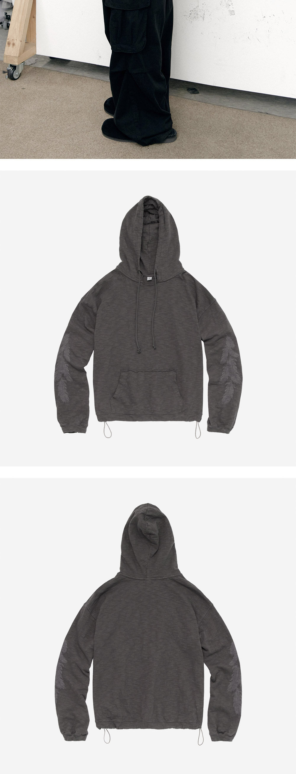 feather raw cut hoodie - 슬럽감 있는 원단 - 소매 페더 프린팅 - 러프한 컷아웃 디테일 - 전면 캥거루 포켓 - 루즈한 소맷단 & 밑단 립 - 레이어링에 적합한 크롭한 밸런스 *모델: 170 중반 / 마른 체형, 3사이즈 착용