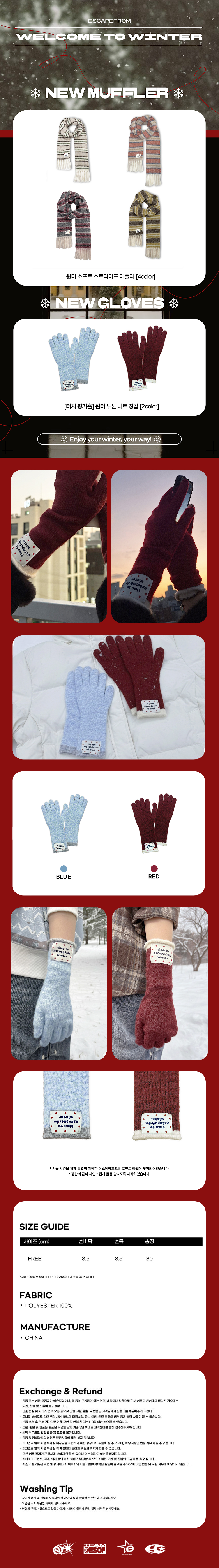 이스케이프프롬 터치 핑거홀 윈터 투톤 니트 장갑 버건디
