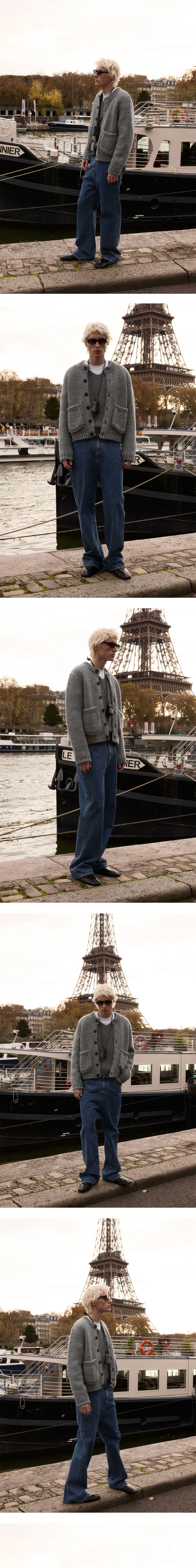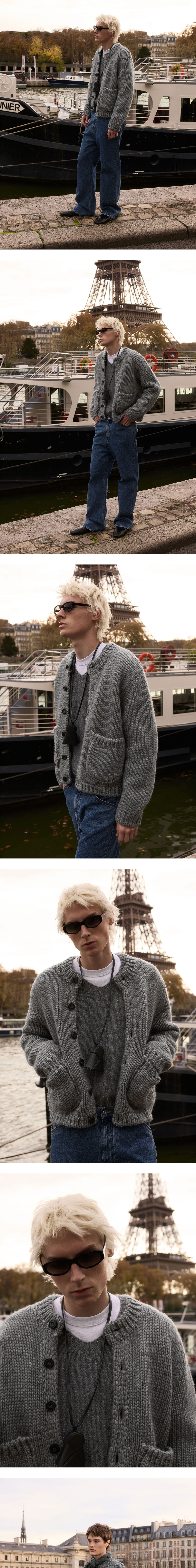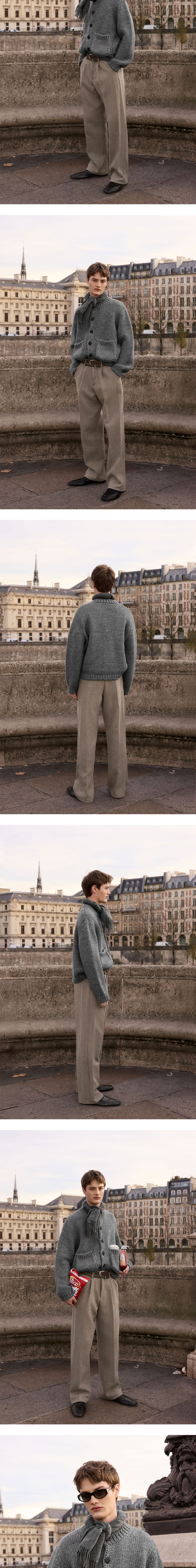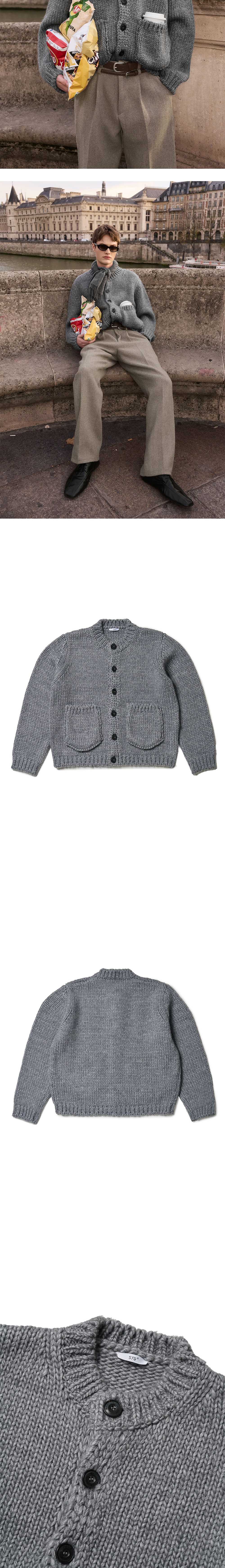 - 스탠다드 핏 - 라운드넥 가디건 실루엣 - 입체 포켓 디테일 - 로고 각인 소뿔 단추