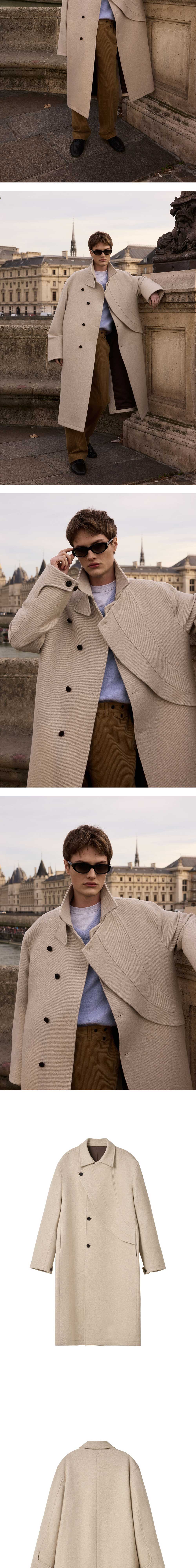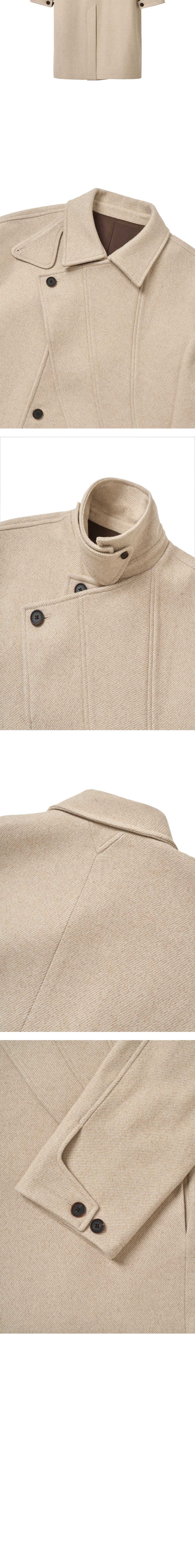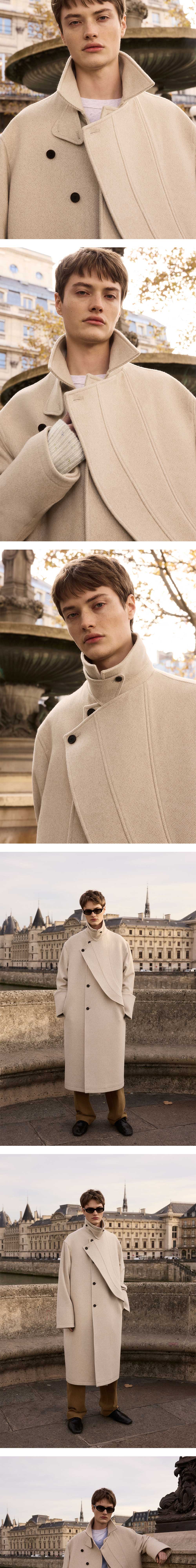 - 루즈 핏 - 하이넥 실루엣 - 헤링본 패턴 - 레이어드 건플랩 디테일 - 절개 디테일 - 카라 비조 디테일 - 소매 비조 디테일 - 로고 각인 소뿔 단추