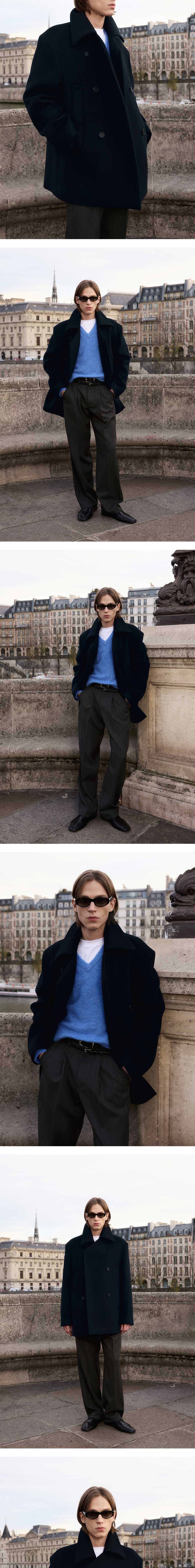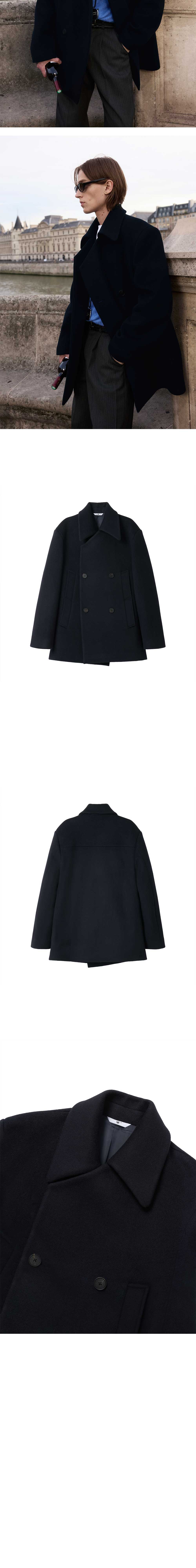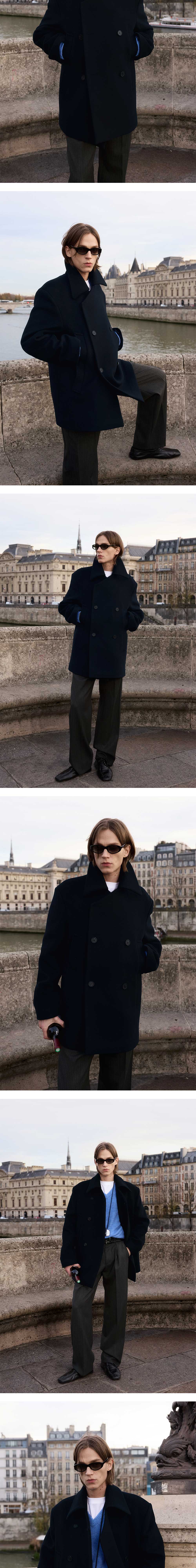 - 루즈 핏 - 피코트 실루엣 - 앞판 히든 스냅 디테일 - 더블 사이드 포켓 디테일 - 로고 각인 소뿔 단추 - 스트라이프 패턴 안감