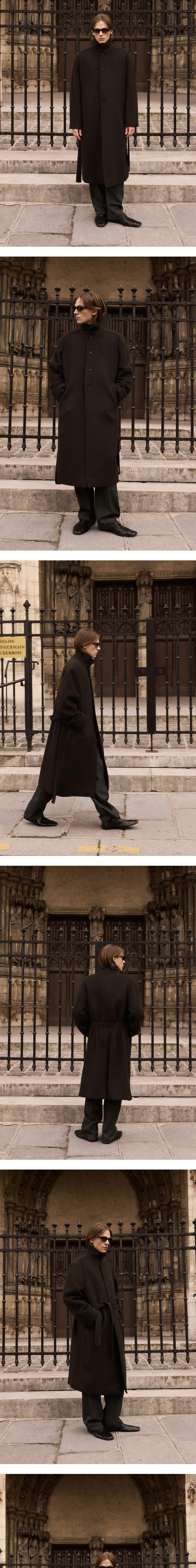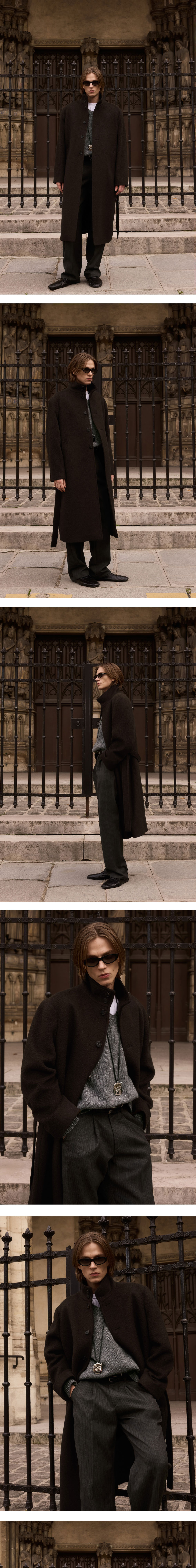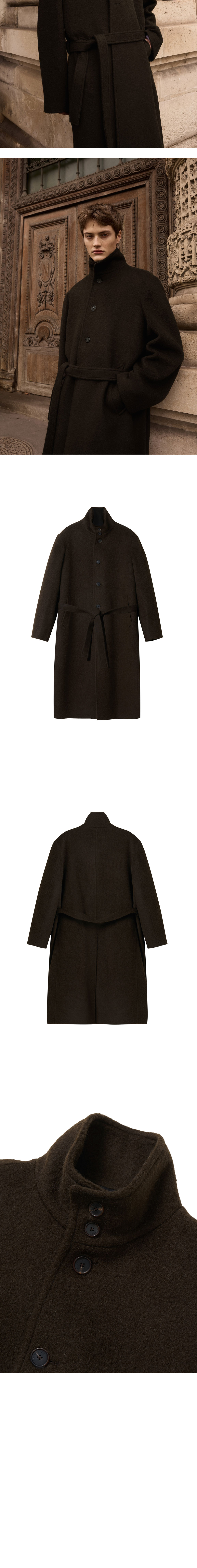 - 루즈 핏 - 하이넥 실루엣 - 벨트 디테일 - 사이드 벨트 고리 - 로고 각인 소뿔 단추