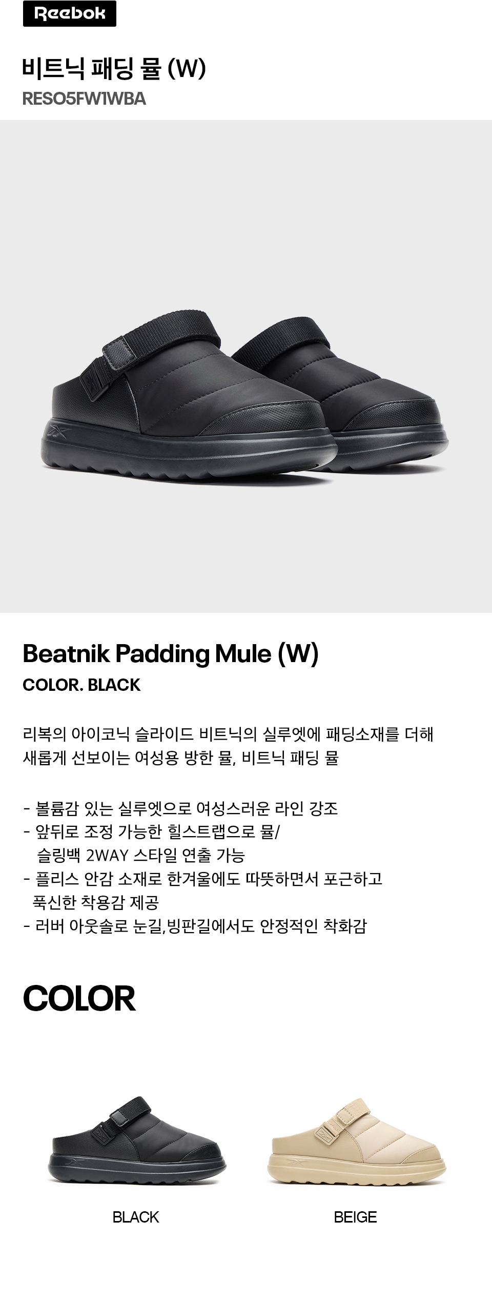 리복 비트닉 패딩 뮬 우먼 블랙
