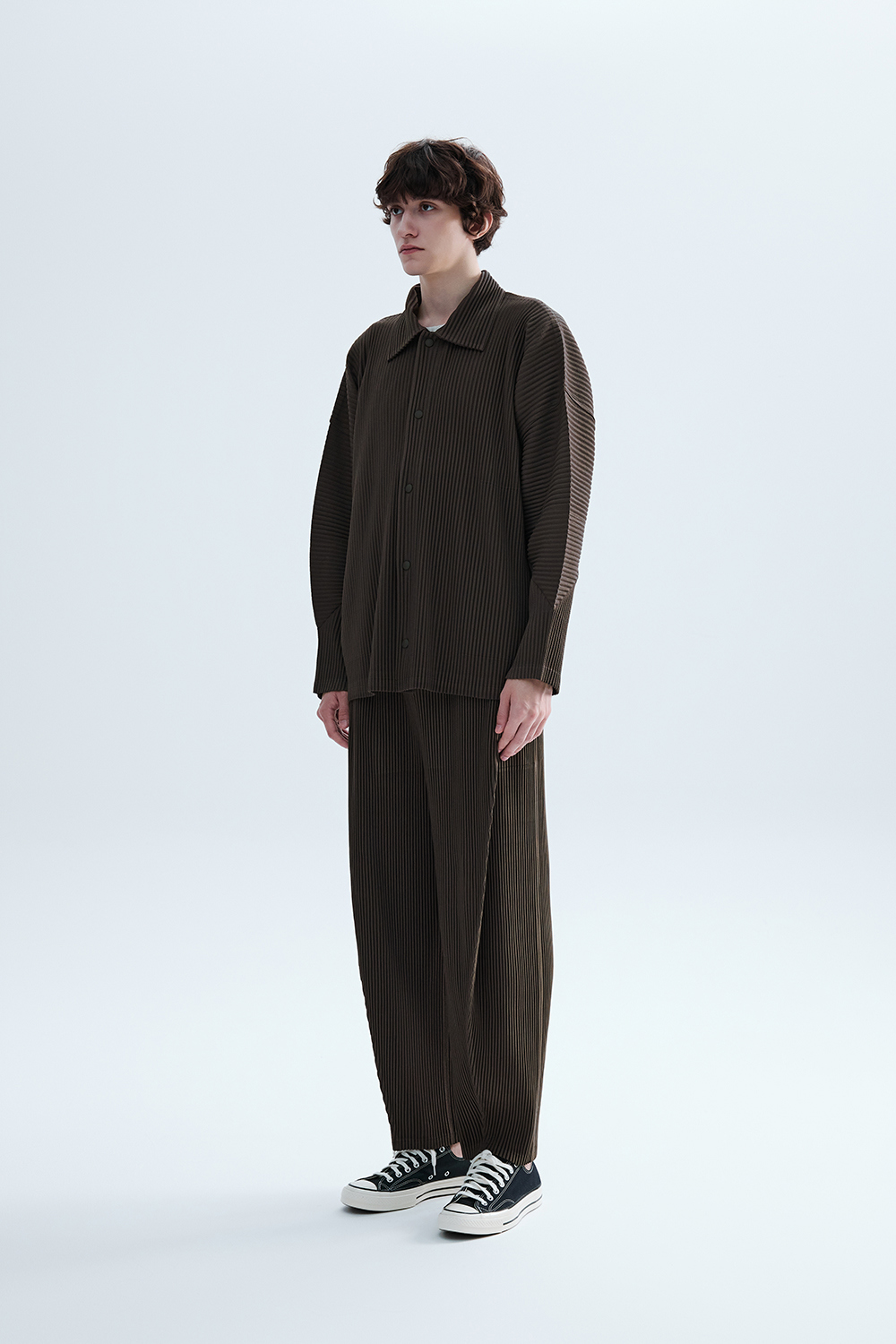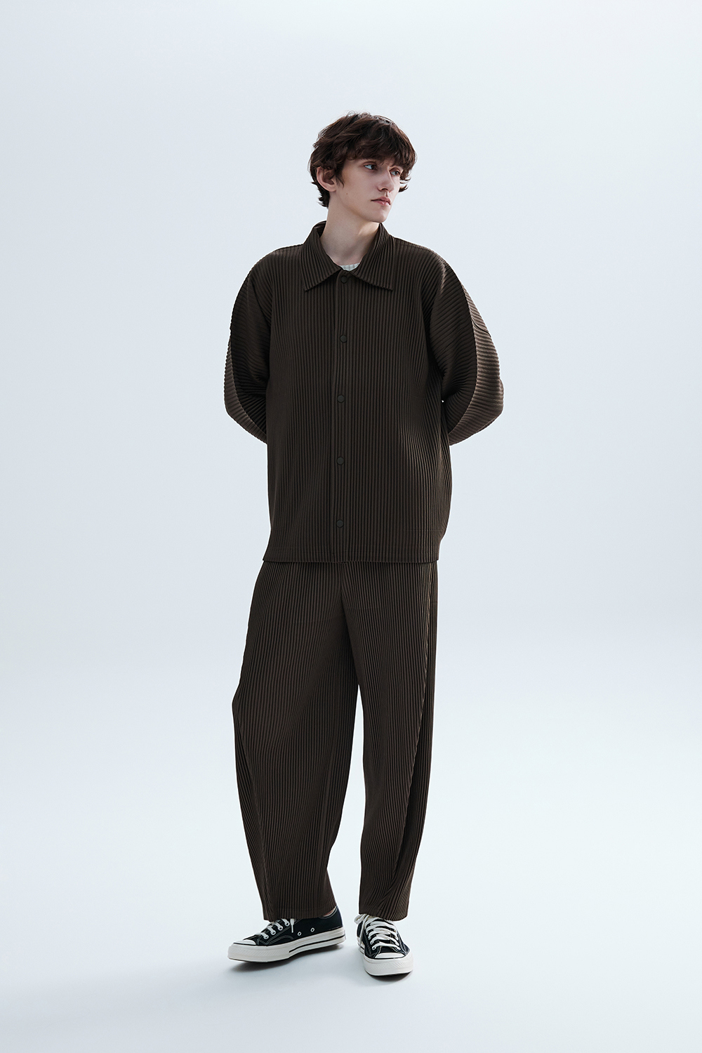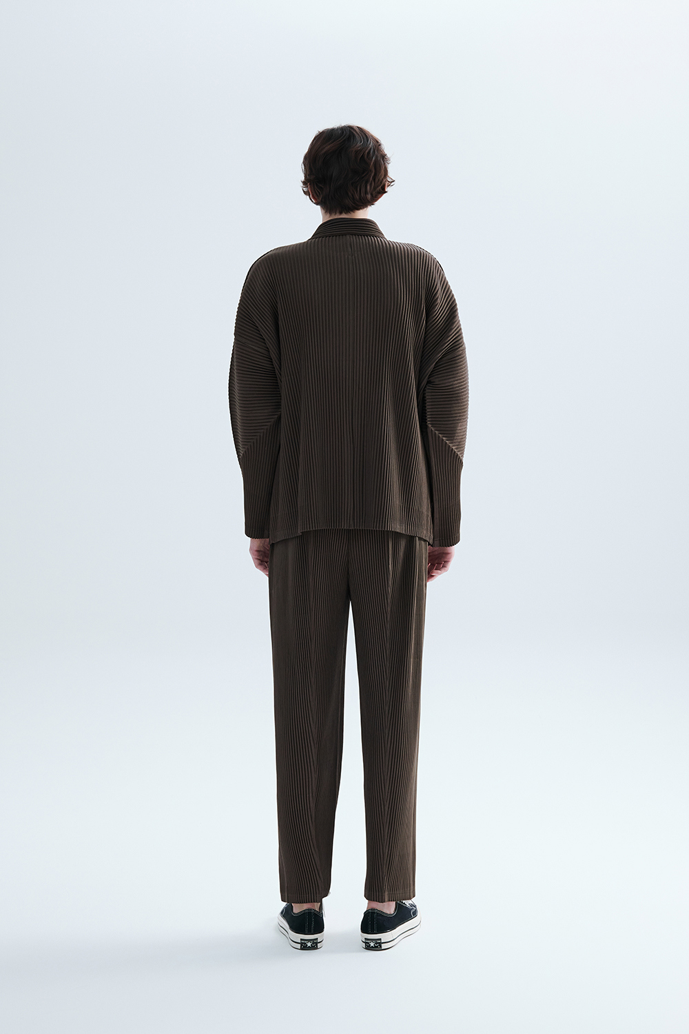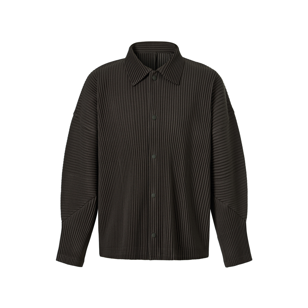 몽플리쎄 공용 텍스쳐드 커브 슬리브 카라형 플리츠 자켓 브라운