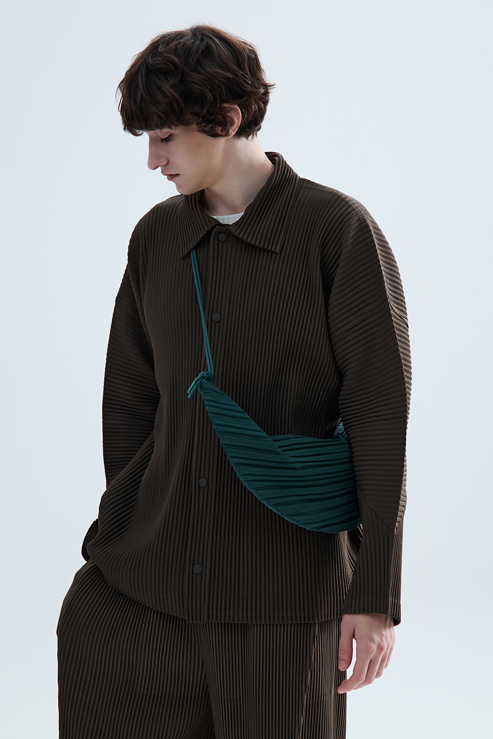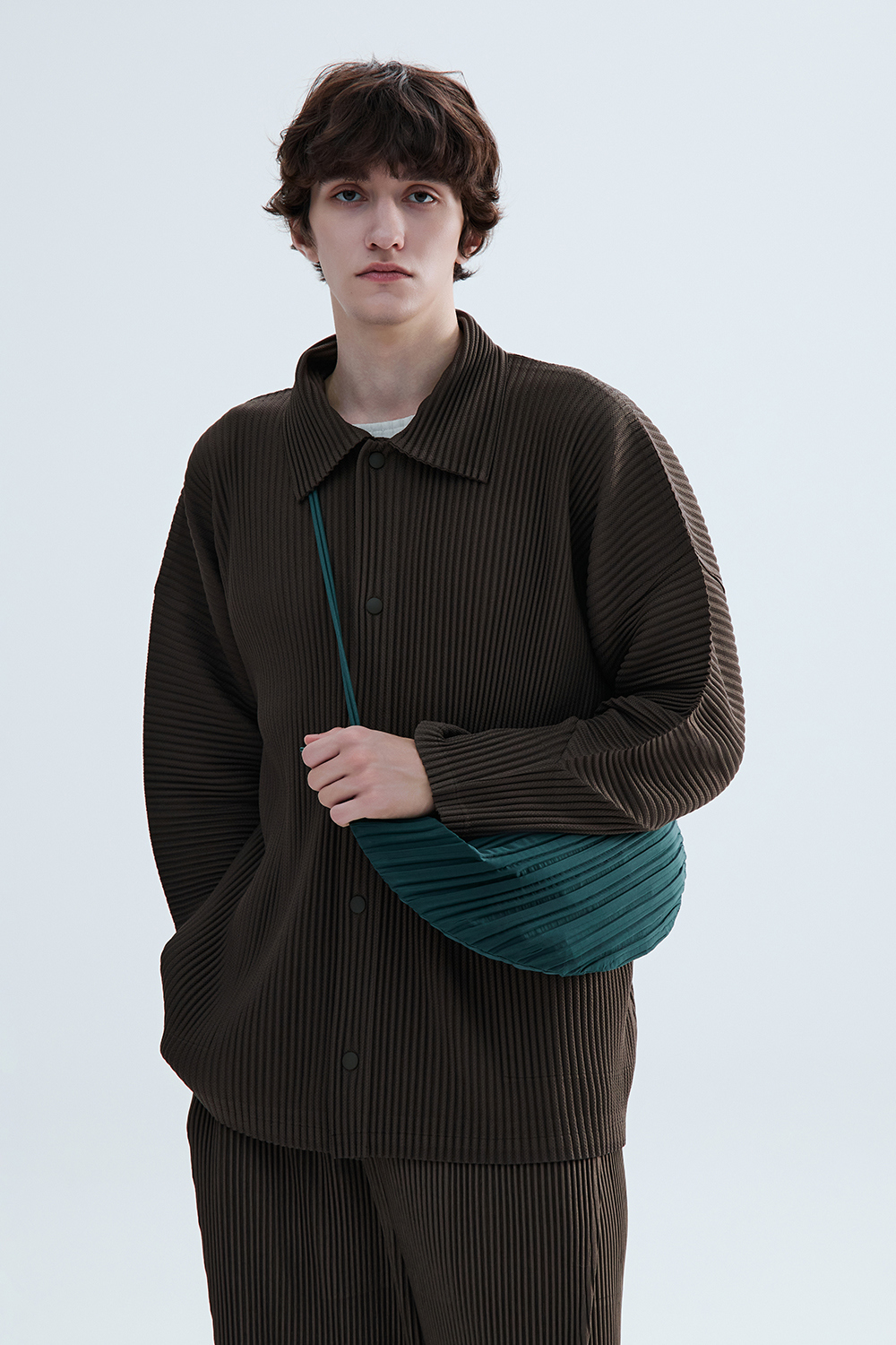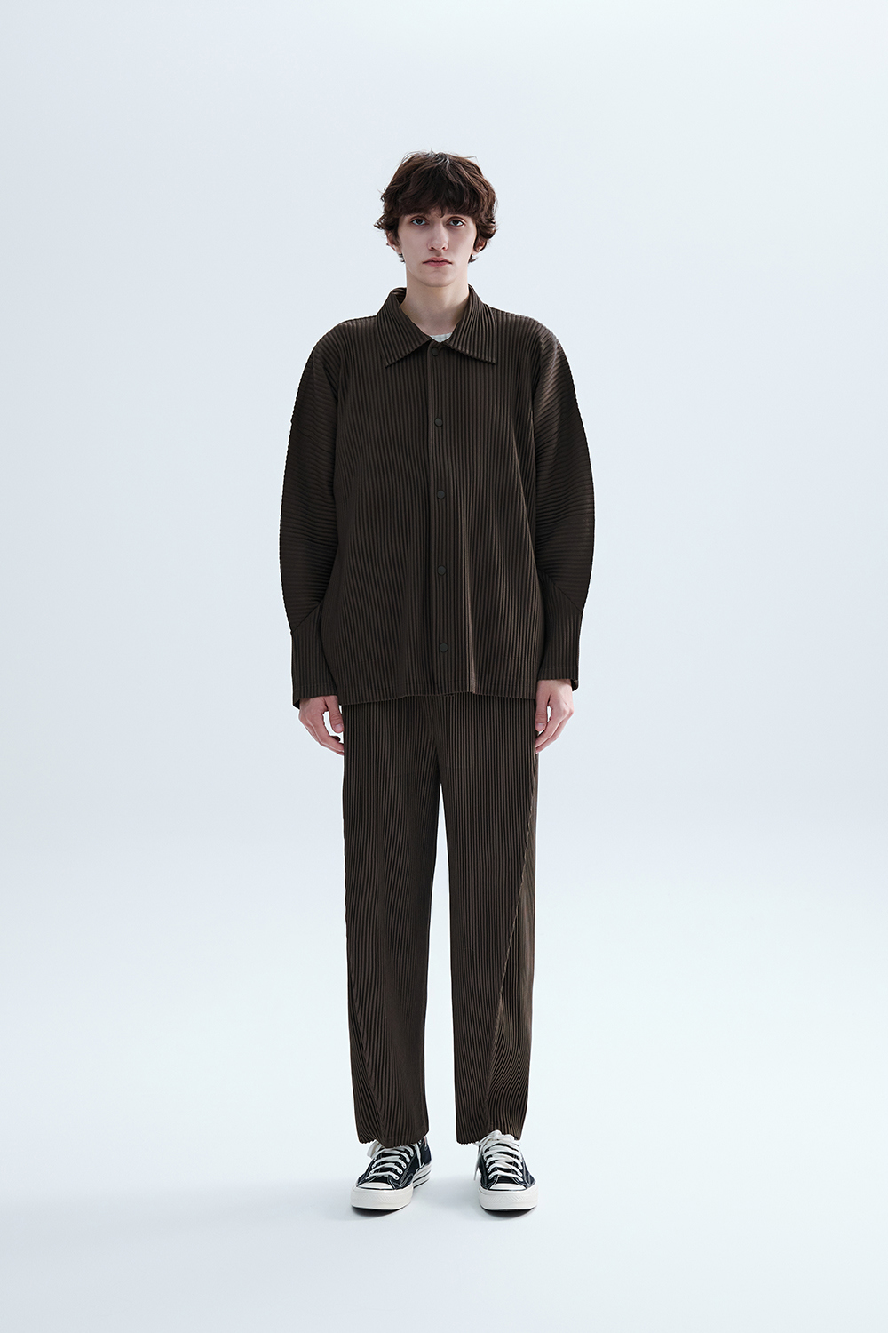 몽플리쎄 공용 텍스쳐드 커브 슬리브 카라형 플리츠 자켓 브라운