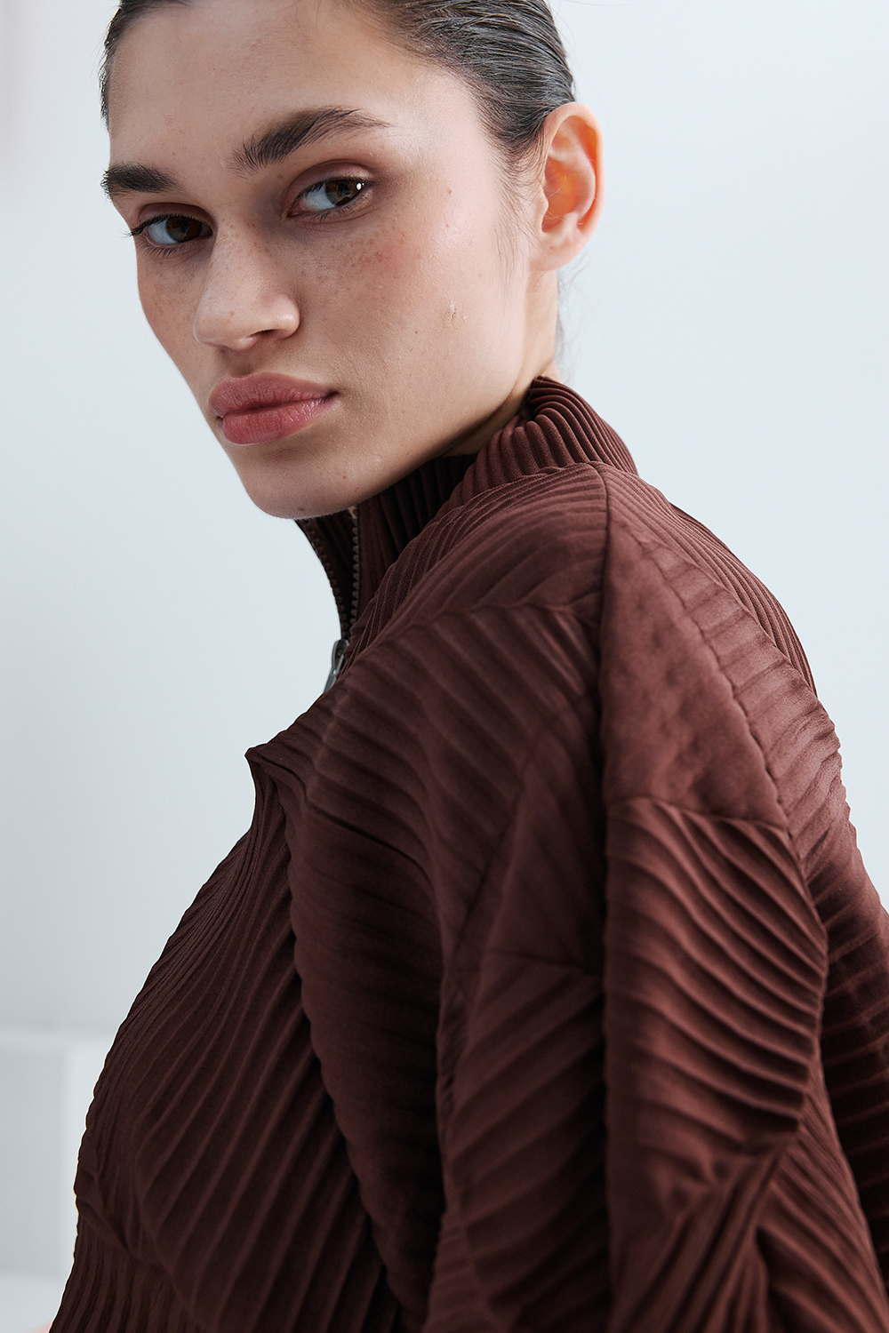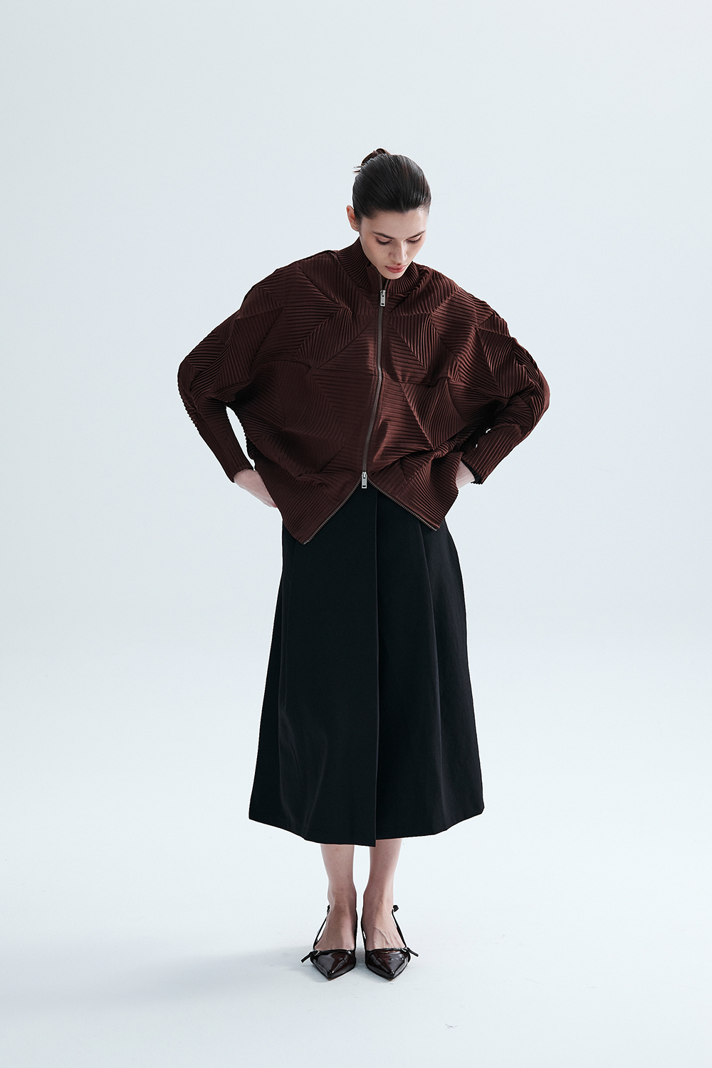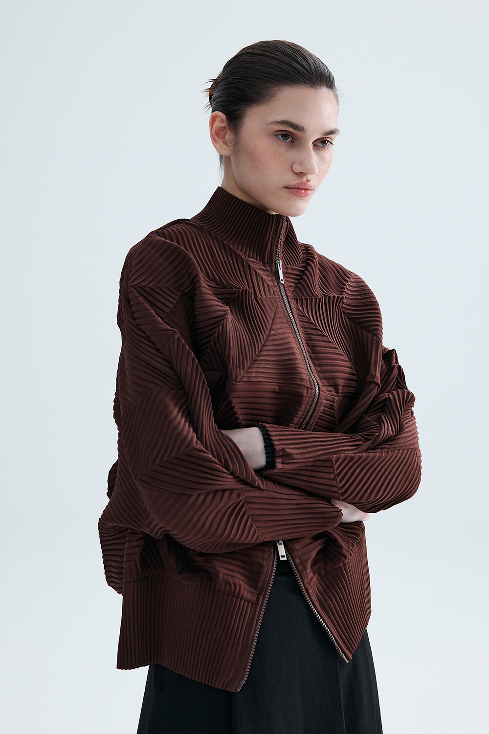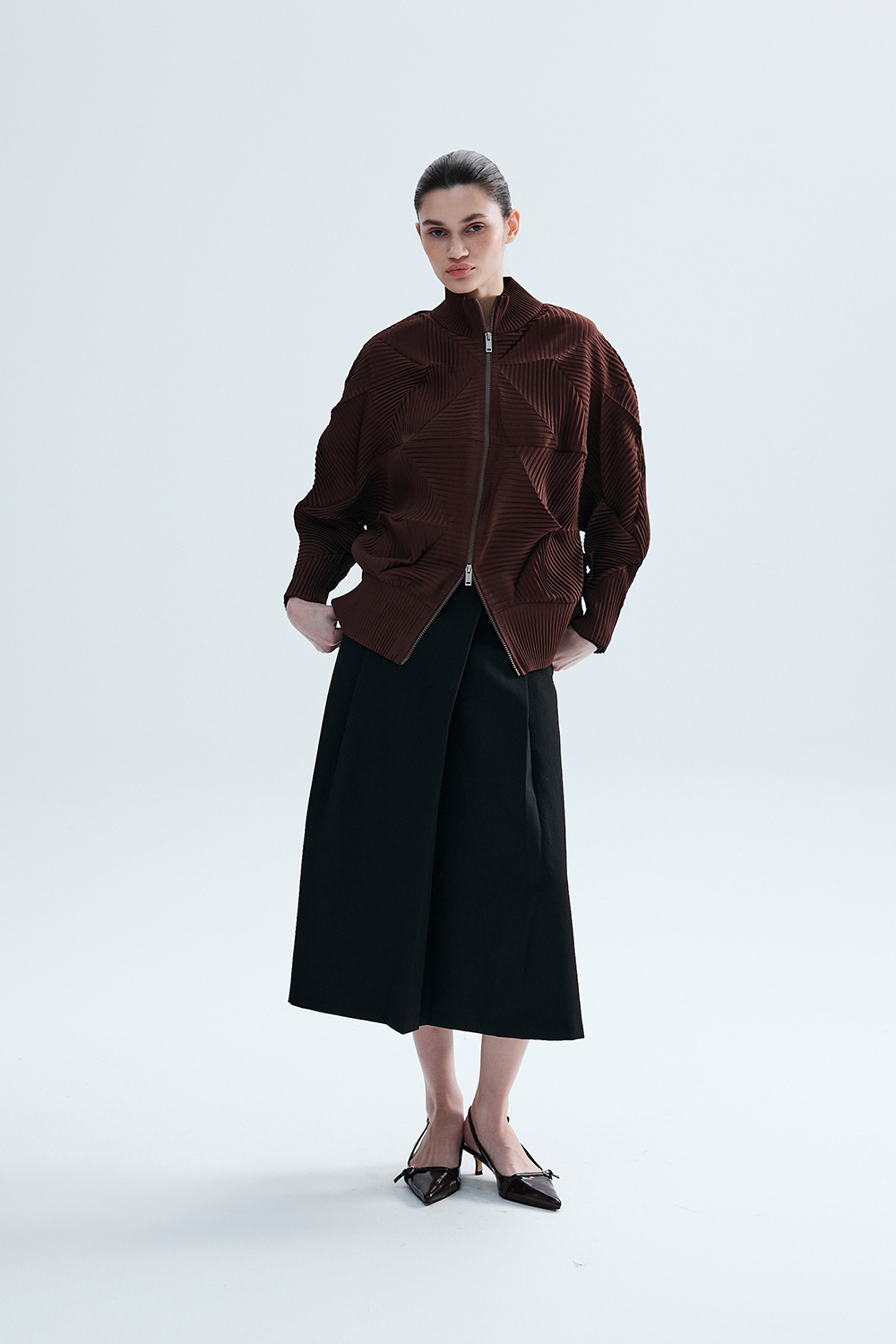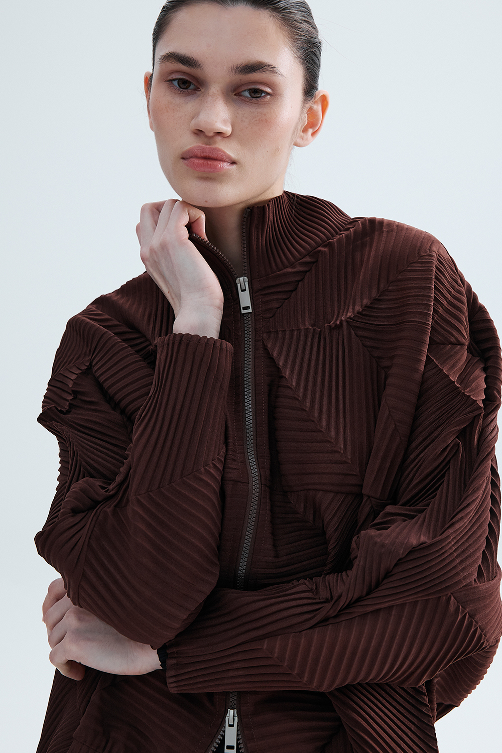 Monplisse Women Hexagon Pleats Zip up Cardigan (Brown)