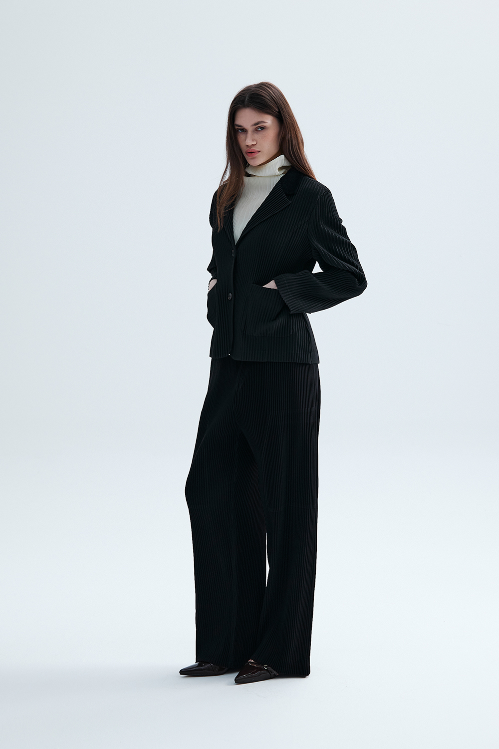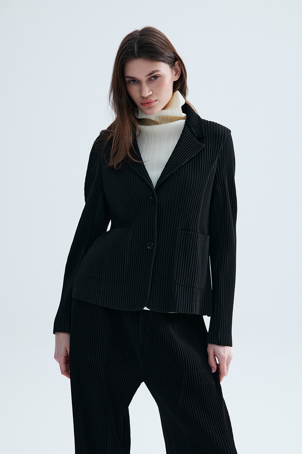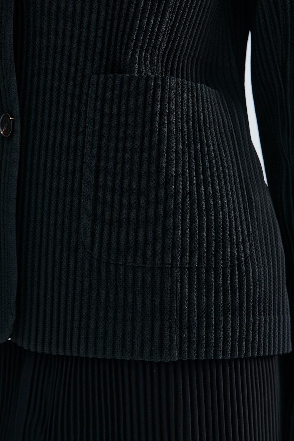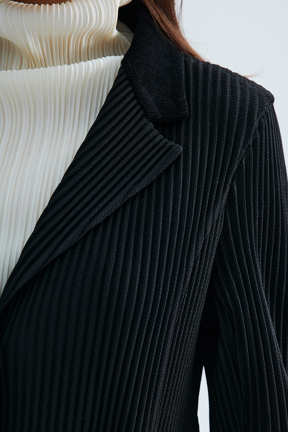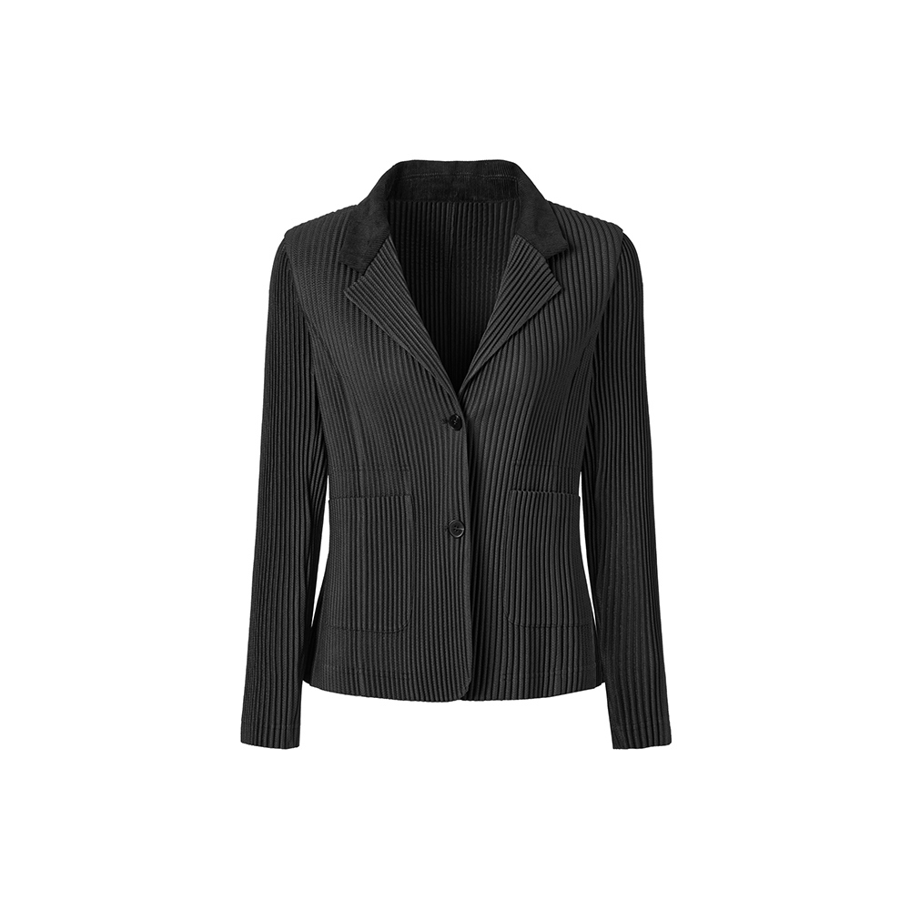 몽플리쎄 여성 코듀로이 배색 포멀 플리츠 자켓 블랙