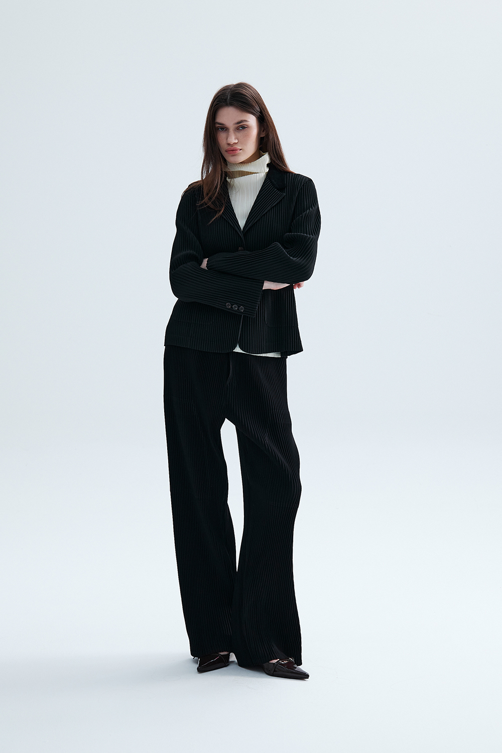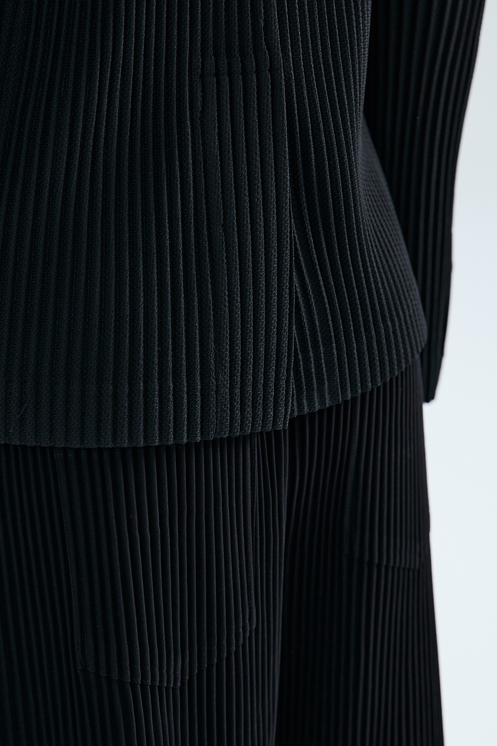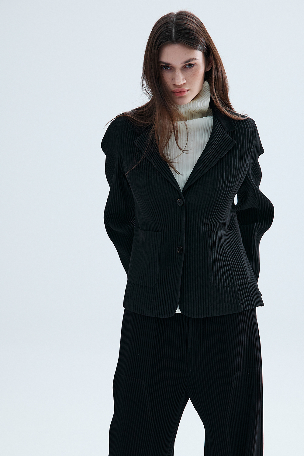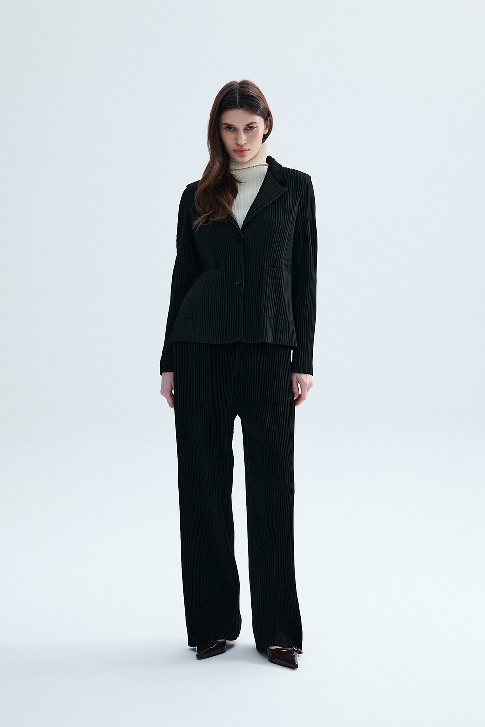 몽플리쎄 여성 코듀로이 배색 포멀 플리츠 자켓 블랙