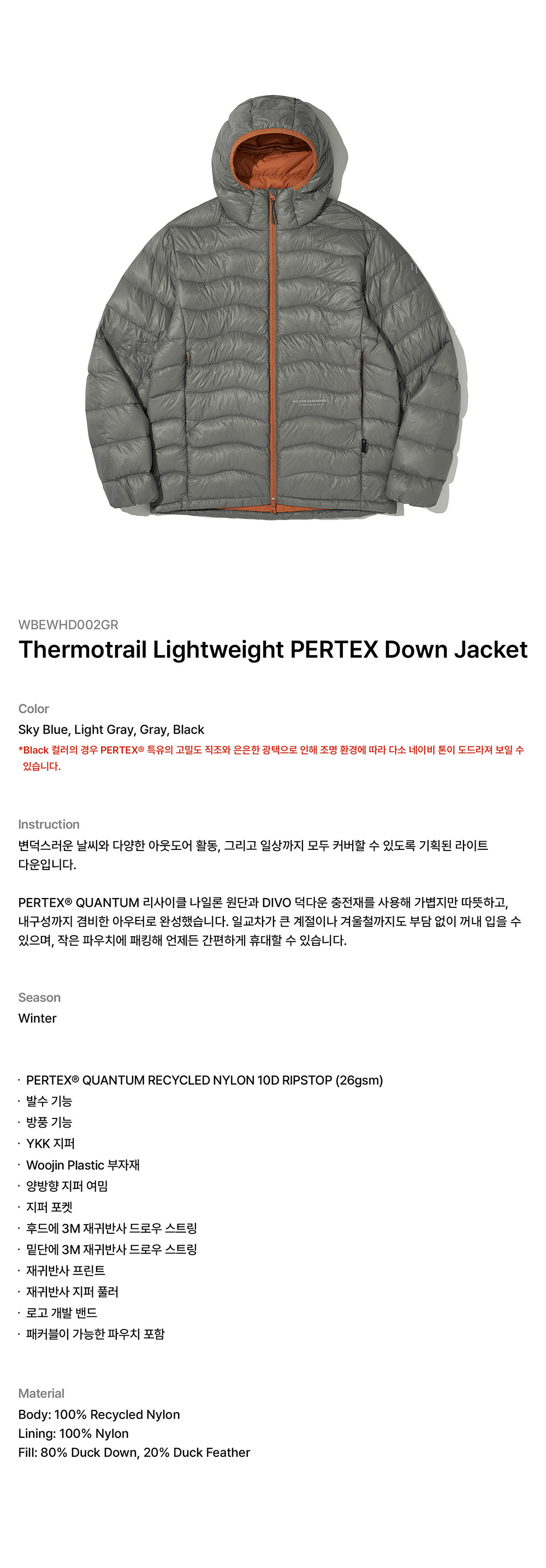 웰터 익스페리먼트 설모트레일 라이트웨이 퍼텍스 다운 자켓 그레이