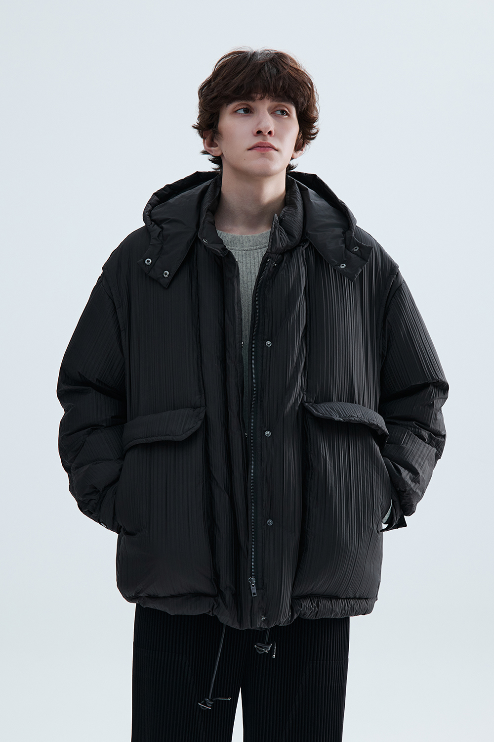 Monplisse Unisex Puff Plisse Hoodie Goose Down Outer (Black)