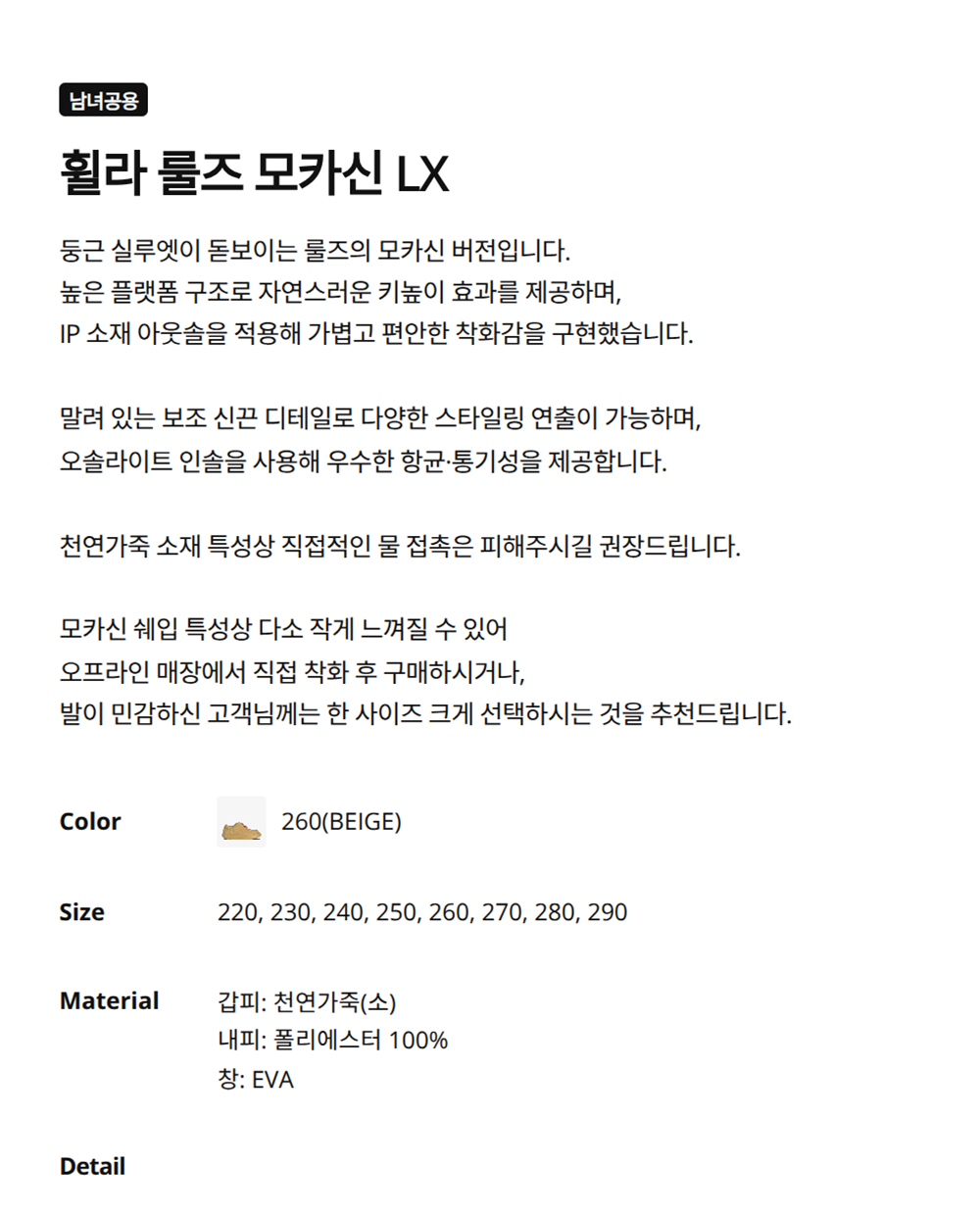 둥근 실루엣이 돋보이는 룰즈의 모카신 버전입니다. 높은 플랫폼 구조로 자연스러운 키높이 효과를 제공하며, IP 소재 아웃솔을 적용해 가볍고 편안한 착화감을 구현했습니다. 말려 있는 보조 신끈 디테일로 다양한 스타일링 연출이 가능하며, 오솔라이트 인솔을 사용해 우수한 항균·통기성을 제공합니다. 천연가죽 소재 특성상 직접적인 물 접촉은 피해주시길 권장드립니다. 모카신 쉐입 특성상 다소 작게 느껴질 수 있어 오프라인 매장에서 직접 착화 후 구매하시거나 발이 민감하신 고객님께는 한 사이즈 크게 선택하시는 것을 추천드립니다.