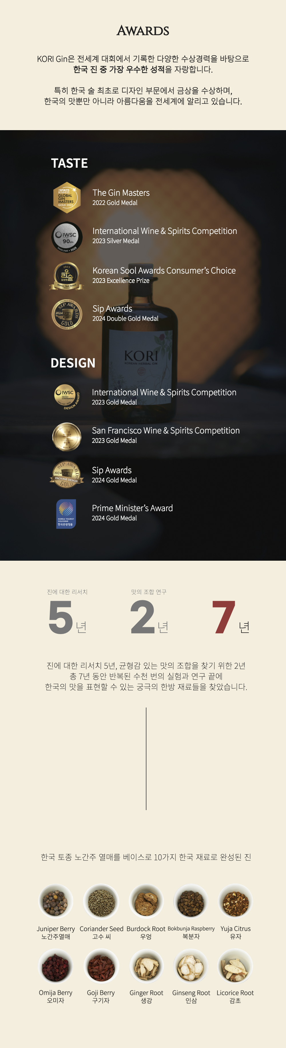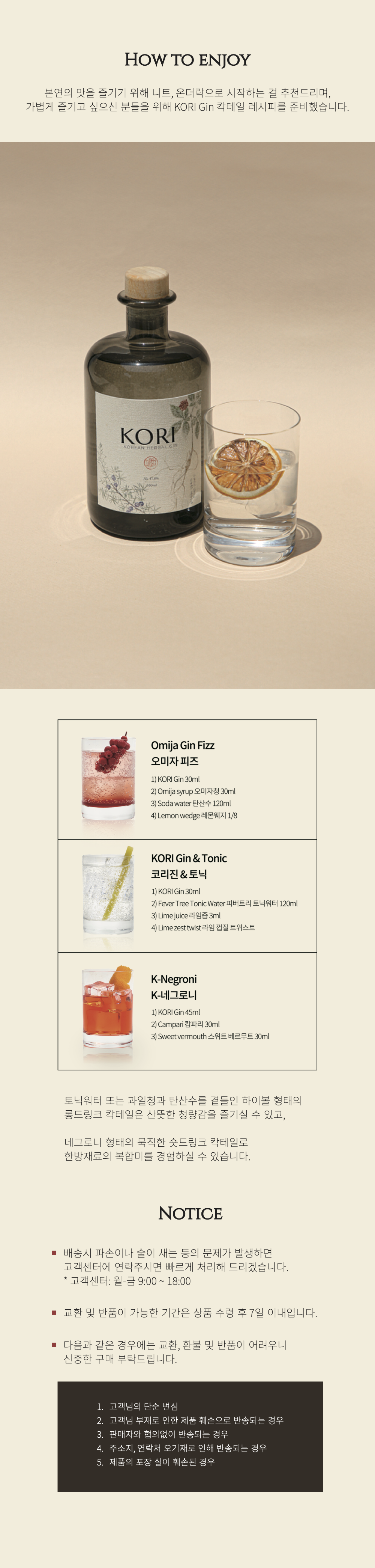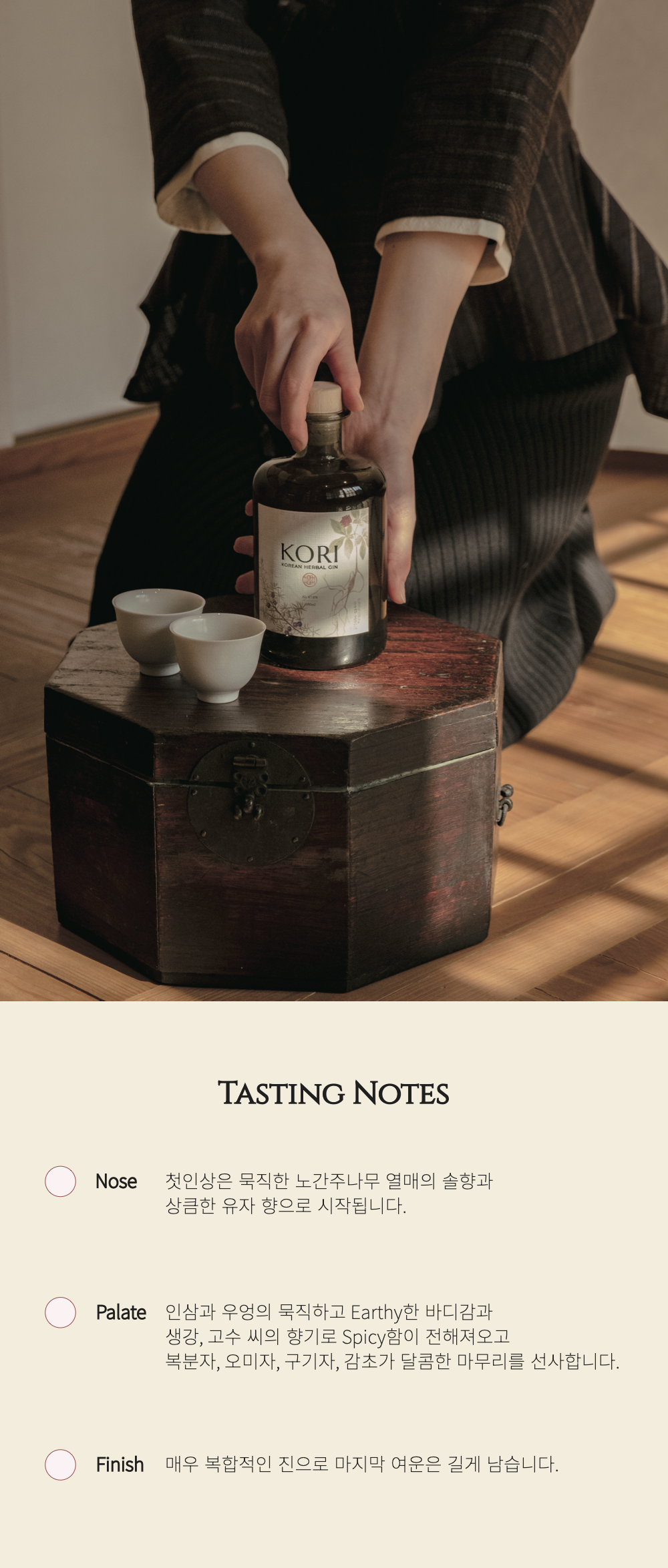 KORI Gin은 한국의 10가지 재료를 정교하게 담아낸 프리미엄 진입니다. 유자·오미자·복분자·인삼 등 한국 보태니컬의 향미가 조화로우며, 깊고 균형 잡힌 47도의 단단한 바디감으로 온더락부터 칵테일까지 다양한 스타일에 잘 어울립니다.