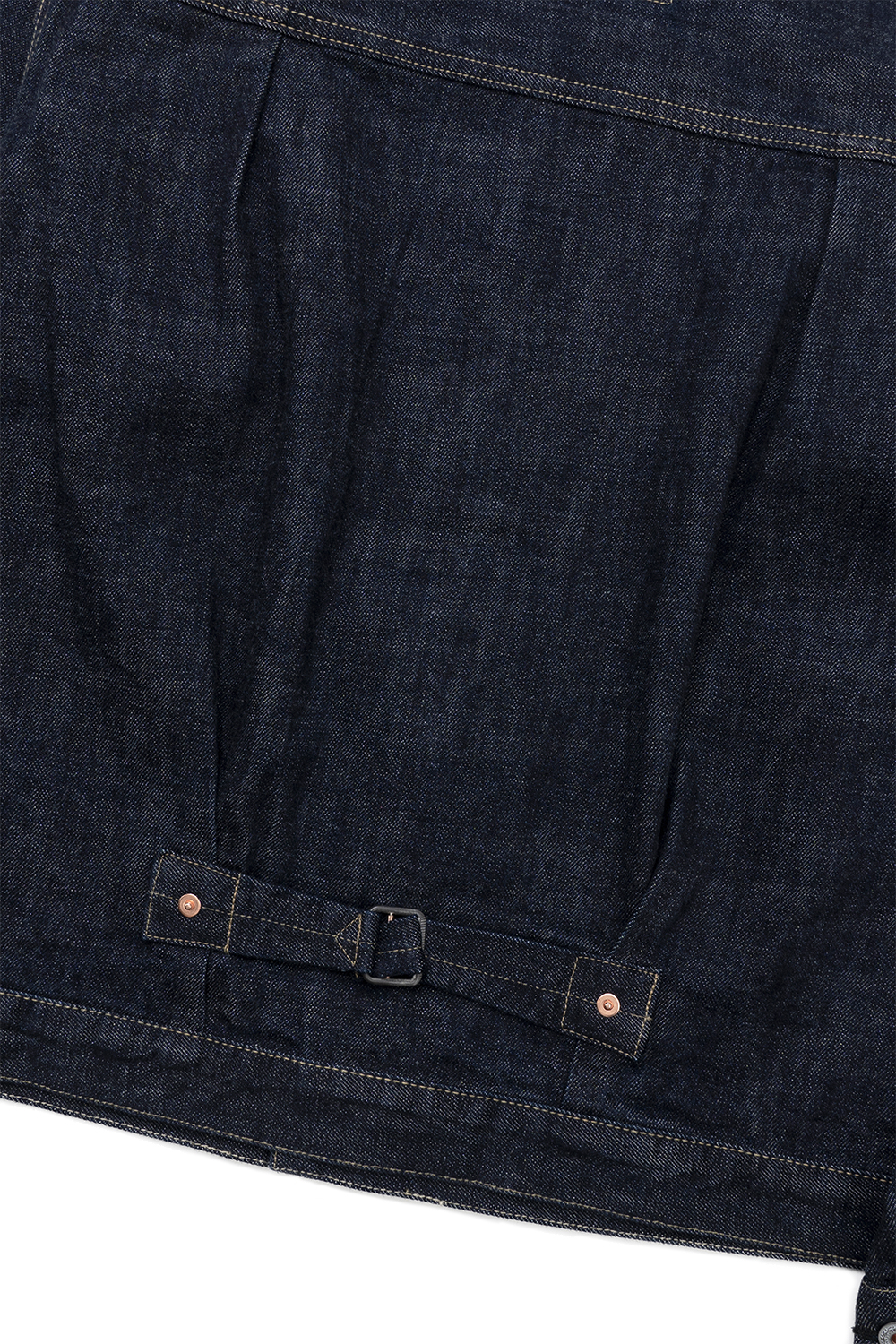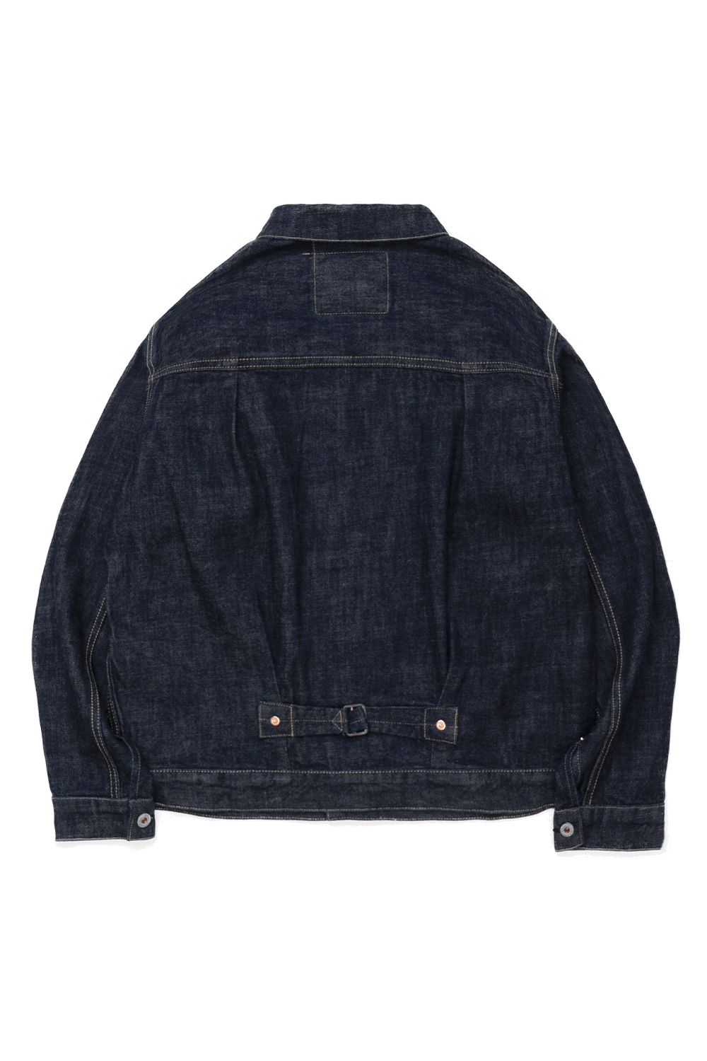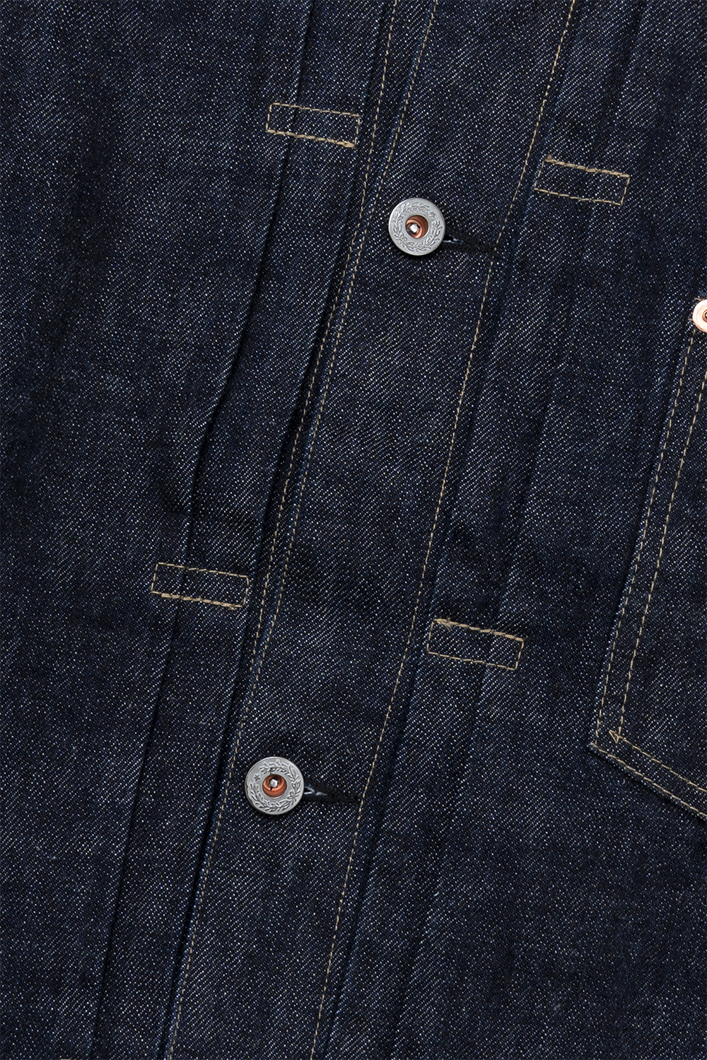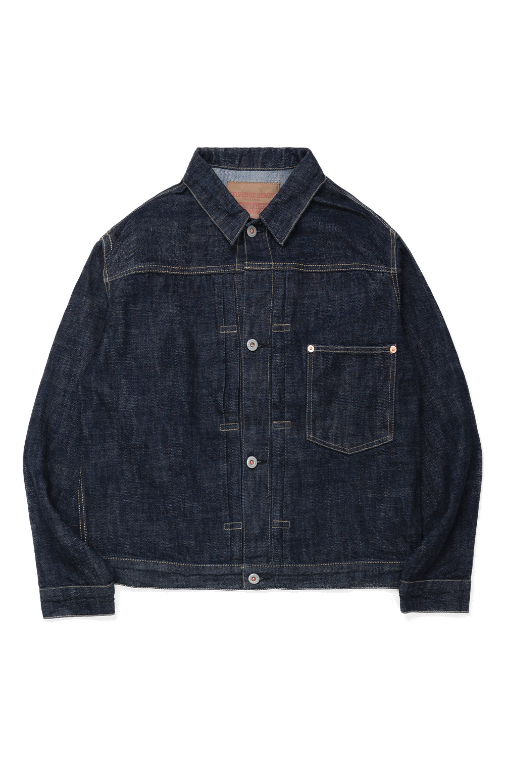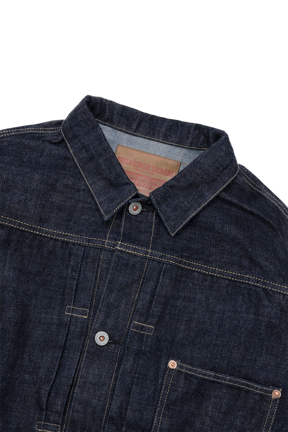 YMCL KY Denim Jacket War Model - Blue 13.5온스 셀비지 데님을 사용한 투박하고 클래식한 대전판 데님 자켓입니다. 구식 셔틀 직기로 정성스럽게 짠 셀비지 데님은 탄탄한 두께감과 독특한 얼룩감, 깊이감 있는 표면으로 시간이 지날수록 페이딩 되며 경년 변화를 느낄 수 있습니다. 셀비지 데님 특유의 빨간색 스티치와 신치백, 월계수 버튼, 구리 리벳 등의 특징이 있습니다. 콜렉터 사이에서도 인기있는 제2차 대전기의 데님 재킷을 충실하게 복각했습니다. 전시하의 미국 내 산업의 물자 통제에 의해 포켓의 플랩을 폐지, 프런트의 버튼이 4개로 변경, 도넛 버튼의 사용 등의 세세한 디테일도 놓치지 않고 복각, 재현하였습니다. 46 사이즈에서는 T-BACK 이 적용되었습니다. * Cotton 100% * YMCL KY 는 합리적인 가격으로 제품을 제공하기 위하여 별도의 포장이 존재하지 않습니다. * 빛에 의한 제품의 색감 차이가 존재 할 수 있습니다. * Made in China