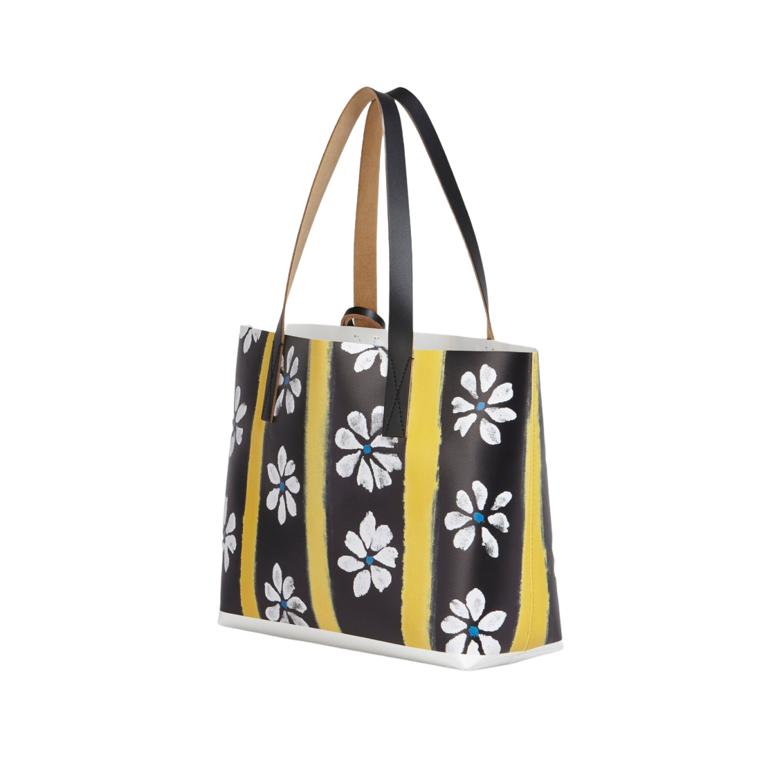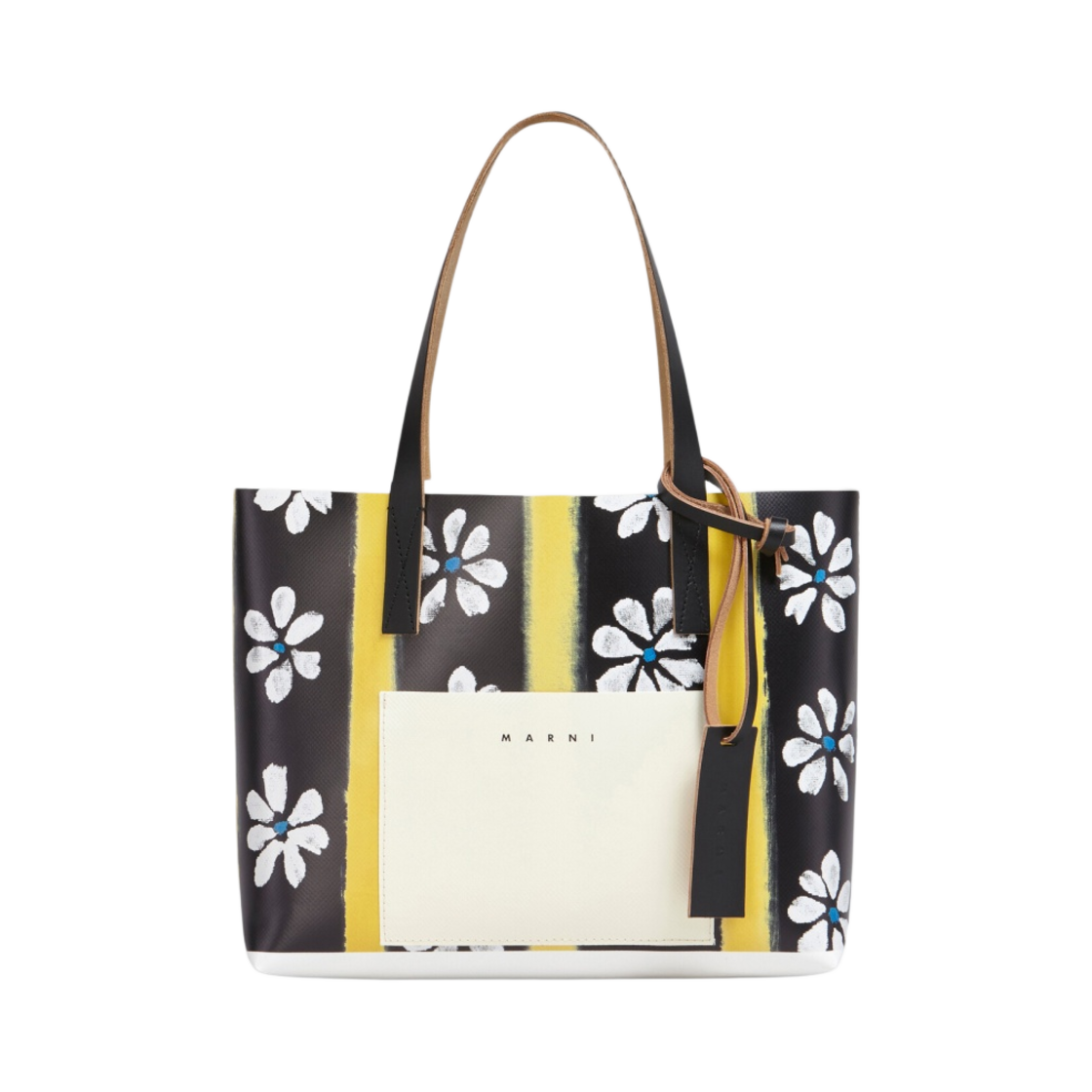 마르니 PVC 오렌지 데이지 레인 프린트 쇼핑백 블랙 실크 화이트