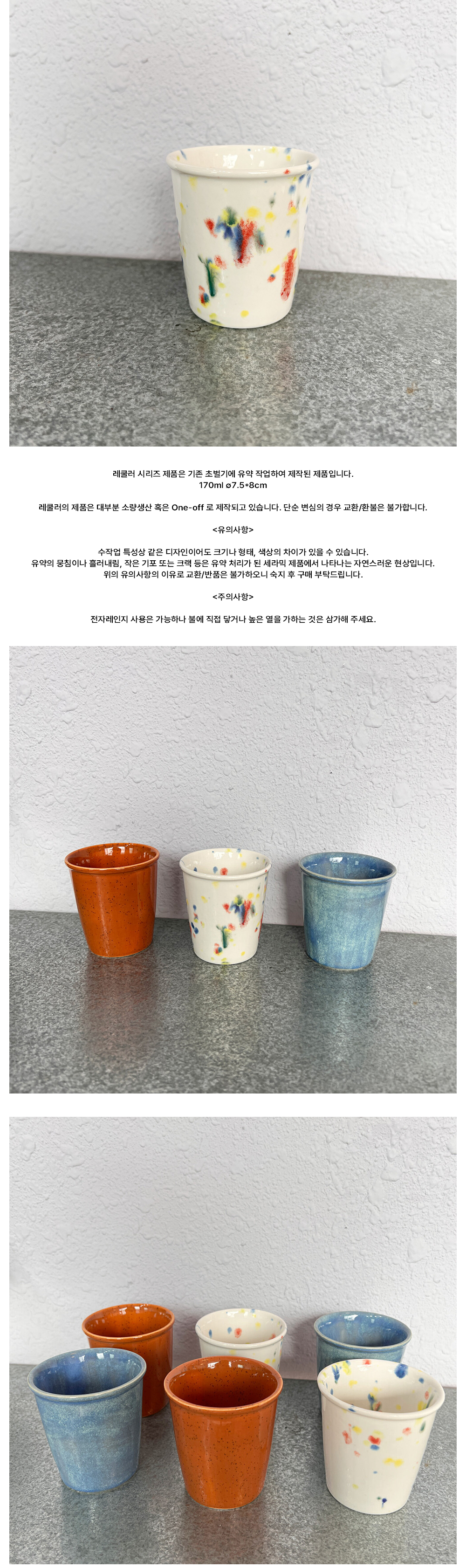 레쿨러 시리즈 제품은 기존 초벌기에 유약 작업하여 제작된 제품입니다. 170ml ∅7.5*8cm 레쿨러의 제품은 대부분 소량생산 혹은 One-off 로 제작되고 있습니다. 단순 변심의 경우 교환/환불은 불가합니다. <유의사항> 수작업 특성상 같은 디자인이어도 크기나 형태, 색상의 차이가 있을 수 있습니다. 유약의 뭉침이나 흘러내림, 작은 기포 또는 크랙 등은 유약 처리가 된 세라믹 제품에서 나타나는 자연스러운 현상입니다. 위의 유의사항의 이유로 교환/반품은 불가하오니 숙지 후 구매 부탁드립니다. <주의사항> 전자레인지 사용은 가능하나 불에 직접 닿거나 높은 열을 가하는 것은 삼가해 주세요.