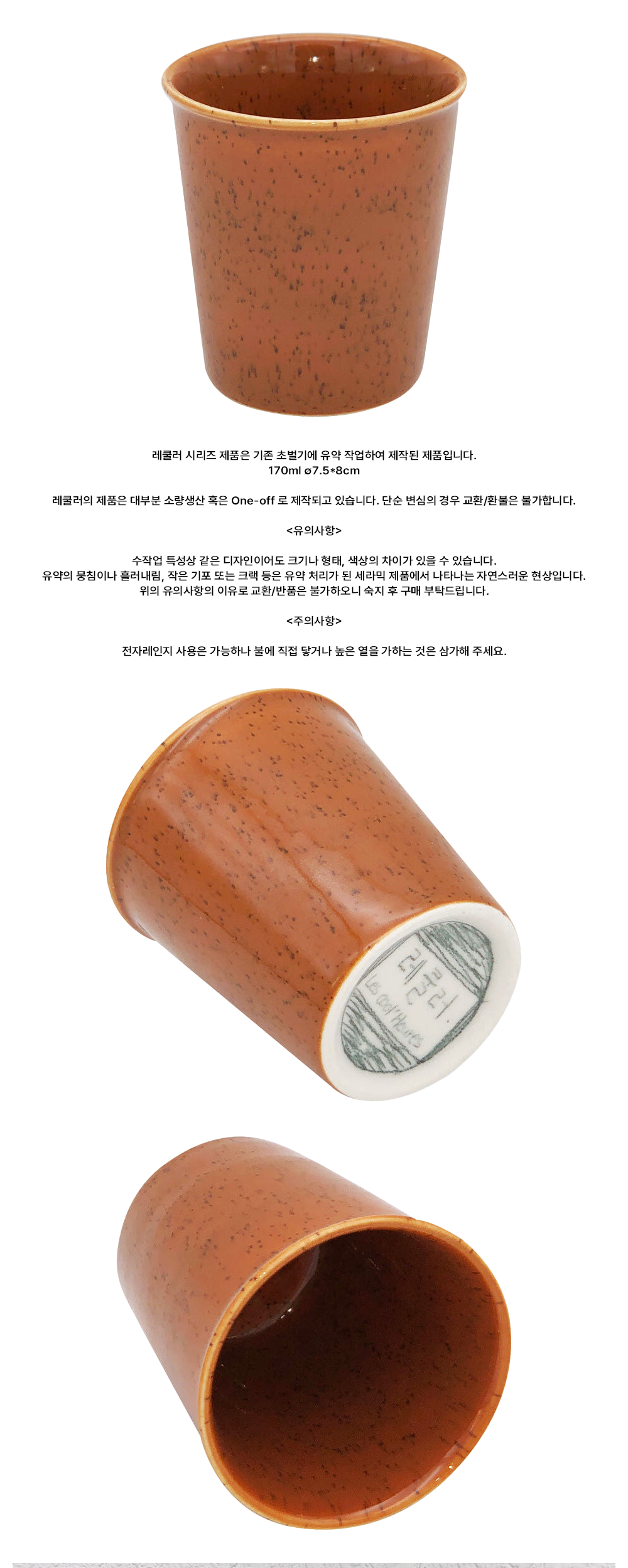 레쿨러 시리즈 제품은 기존 초벌기에 유약 작업하여 제작된 제품입니다. 170ml ∅7.5*8cm 레쿨러의 제품은 대부분 소량생산 혹은 One-off 로 제작되고 있습니다. 단순 변심의 경우 교환/환불은 불가합니다. <유의사항> 수작업 특성상 같은 디자인이어도 크기나 형태, 색상의 차이가 있을 수 있습니다. 유약의 뭉침이나 흘러내림, 작은 기포 또는 크랙 등은 유약 처리가 된 세라믹 제품에서 나타나는 자연스러운 현상입니다. 위의 유의사항의 이유로 교환/반품은 불가하오니 숙지 후 구매 부탁드립니다. <주의사항> 전자레인지 사용은 가능하나 불에 직접 닿거나 높은 열을 가하는 것은 삼가해 주세요.