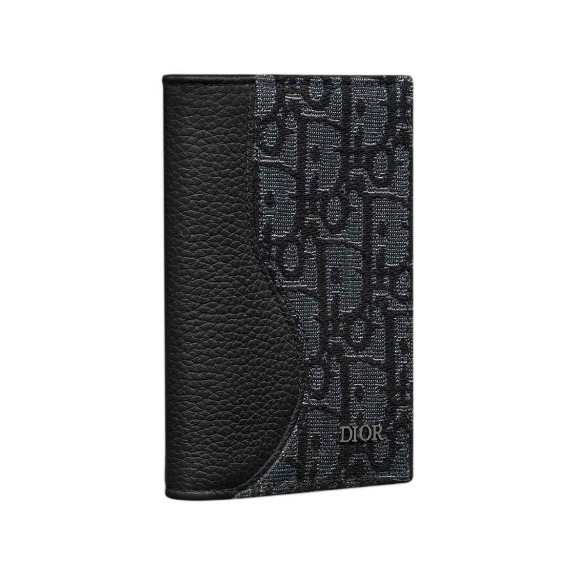 디올 새들 버티컬 더블 카드 홀더 그레인드 카프스킨 & 메탈릭 디올 오블리크 자카드 마르퀘트리 블랙 실버