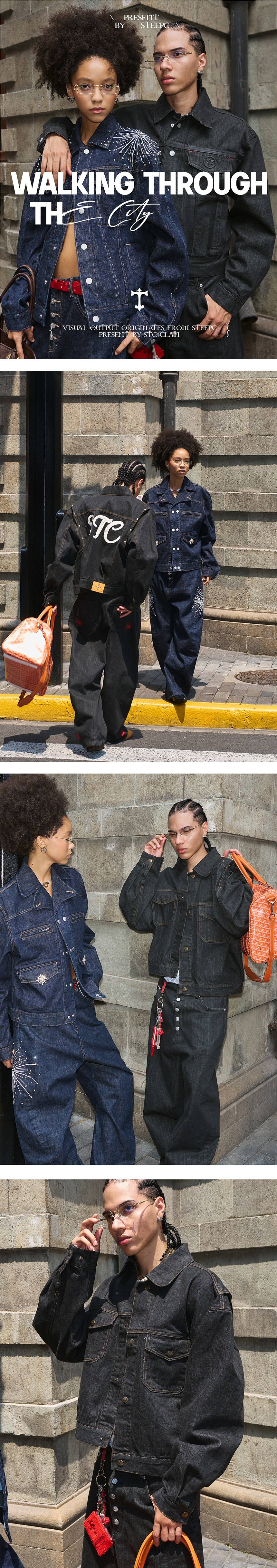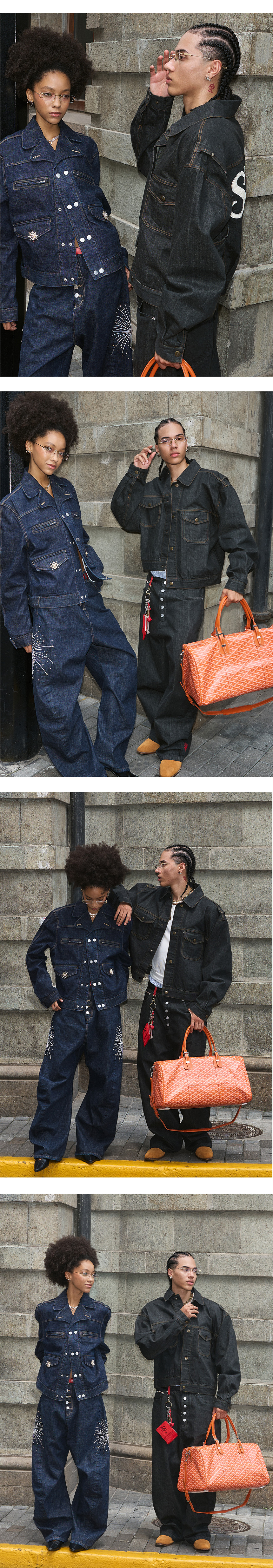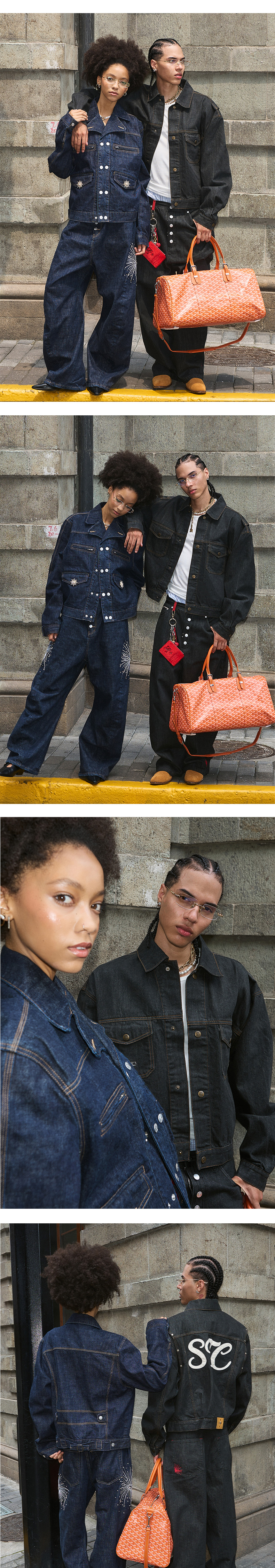 - SDV 데님 사용 - 넥 카라 크롭 셀비지 데님 자켓 - 암홀 라인 스냅 포인트 및 뒷판 브랜드 로고 - 브랜드 자체 로고 단추 사용