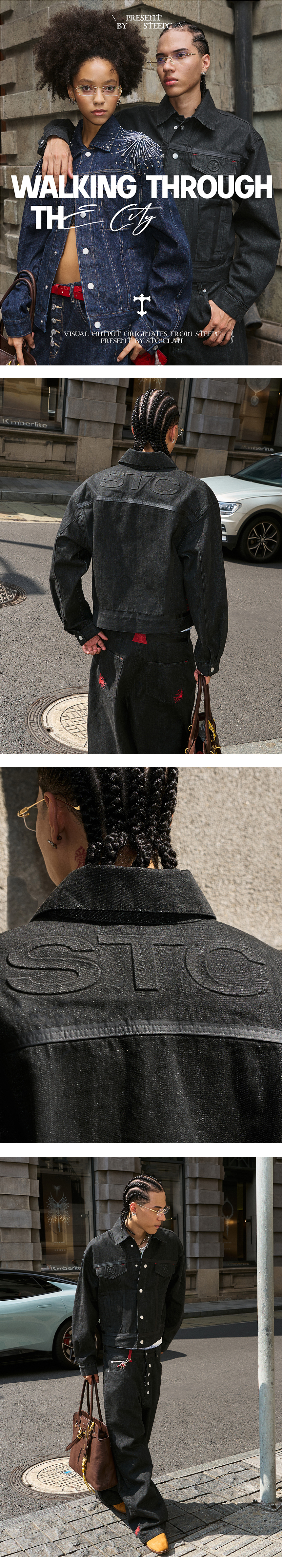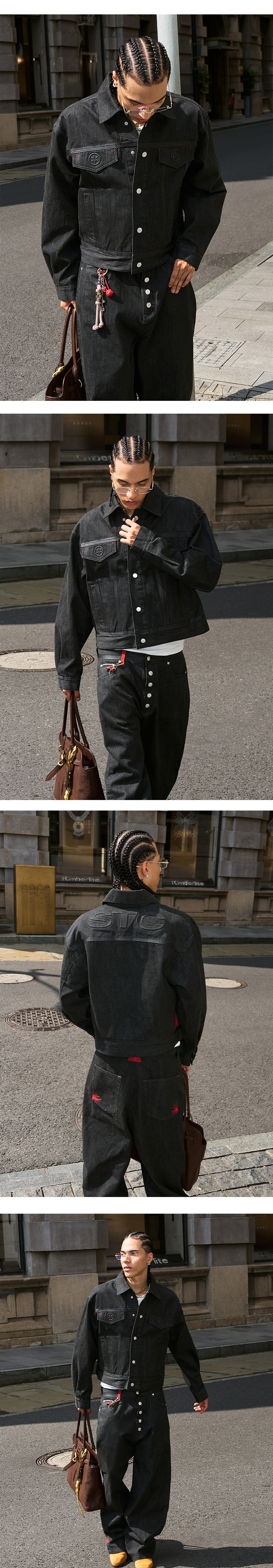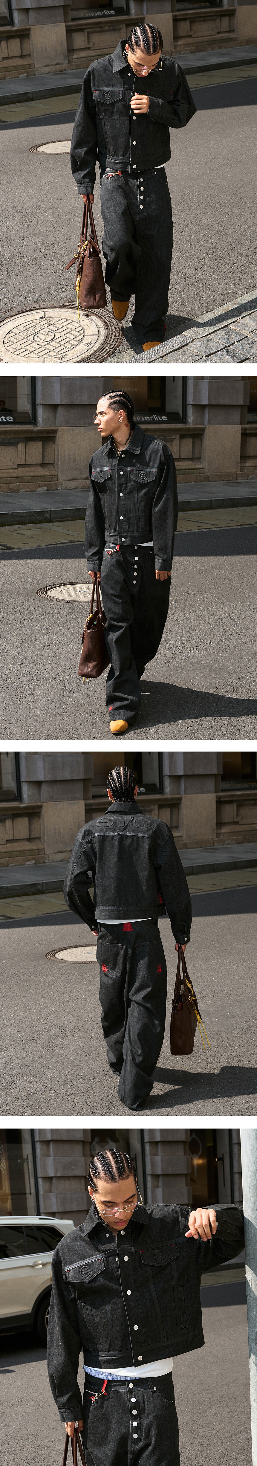 - SDV 데님 사용 - 기하학 패턴의 디자인 - 모던시티 스타일 연출 가능 - 뒷면 브랜드 로고 각인 포인트 - 레드 스티치 디테일