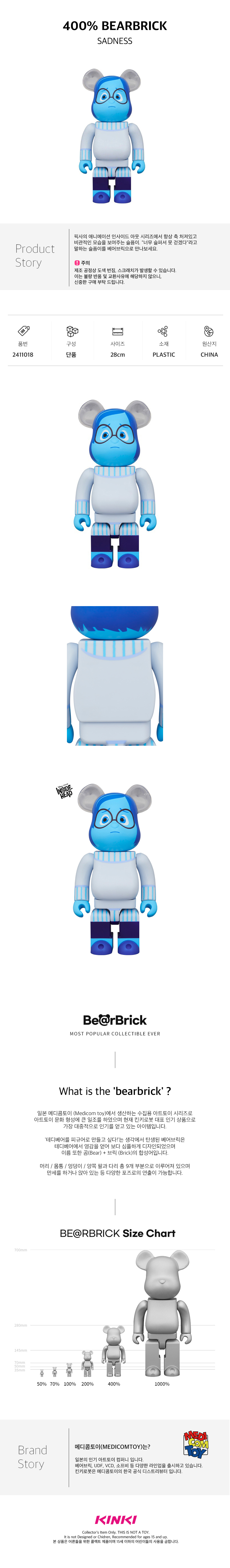 [10%쿠폰] 킨키로봇 400% 베어브릭 인사이드아웃 슬픔이 (2411018)