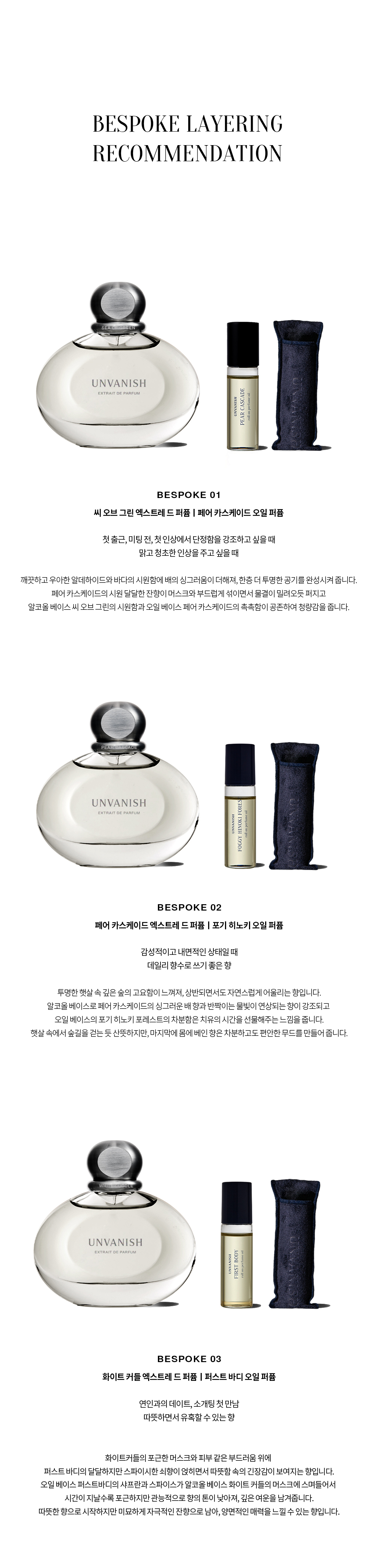 [더 써드 나잇 위드 진 엑스트레 드 퍼퓸 추천 레이어링] 버진 판타지 롤온 럼의 묵직함 위에 라즈베리의 달콤함이 더해진 유혹적인 향, 칵테일이 연상되기도 함 오일베이스 버진 판타지의 바우더리한 머스크가 알코올 베이스 더 써드 나잇 위드 진의 스모키함을 부드럽게 감싸, 향의 깊이를 더해줌 스모키한 베이스 위에 달달한 레이어가 쌓이면서 밤과 꿈의 경계 같은 몽환적인 분위기를 자아냄 퍼스트 바디 롤온 스모키한 우디향에 달달한 샤프란과 톡 쏘는 스파이시가 더해져, 긴장감과 열기가 상상됨 자칫 독할 수 있는 알코올 베이스 더 써드 나잇 위드 진의 럼 향을 오일 포뮬러인 샤프란과 스파이스가 완화시켜, 부드럽고도 달콤하게 여운을 남김 따뜻한 오일 포뮬러와 차가운 알코올(럼)의 대조가 입체적으로 다가옴